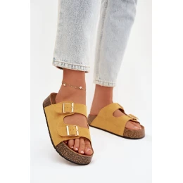 Dámské pantofle na korkové platformě se zlatými sponami Žluté model 21919307 - EVENTO