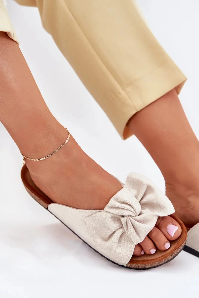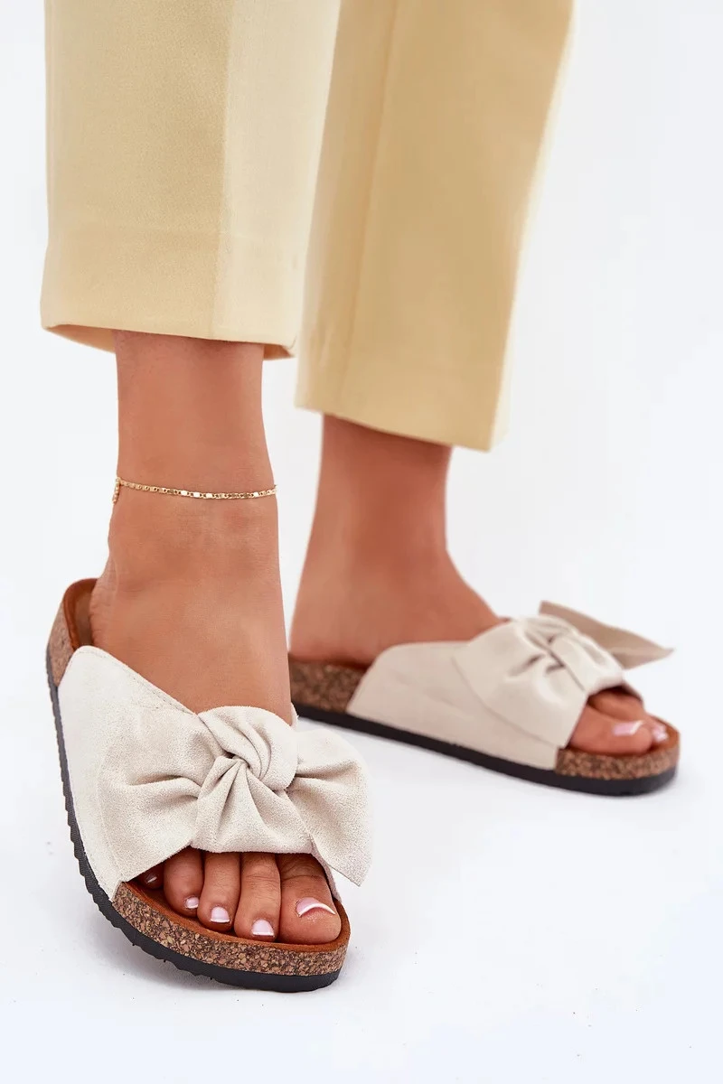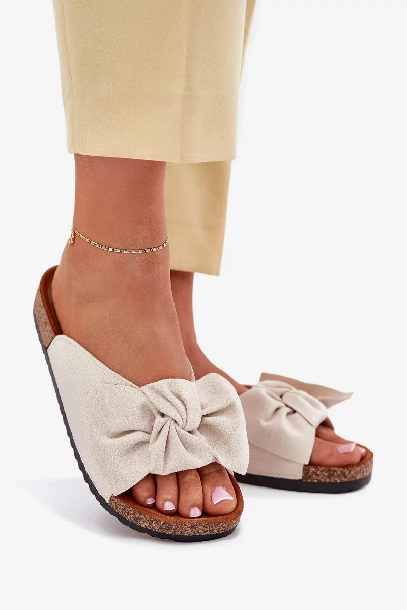 Dámské pantofle na korkové podešvi s ozdobnou mašlí jsou pohodlnou a stylovou volbou pro letní dny. Korková podešev přirozeně tlumí došlap a zajišťuje komfort při chůzi, zatímco mašle na nártu dodává obuvi elegantní a ženský vzhled. Béžové provedení působí jemně a univerzálně, takže se snadno kombinuje s letními outfity.