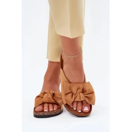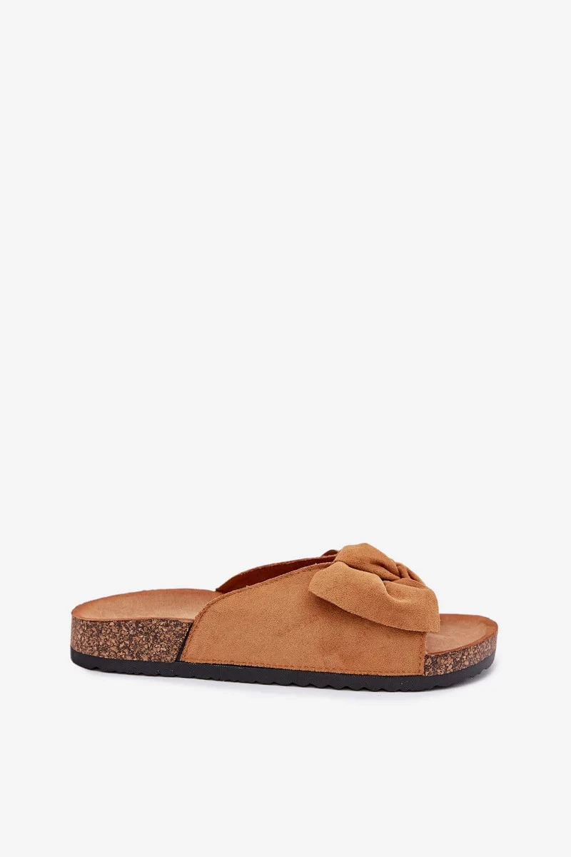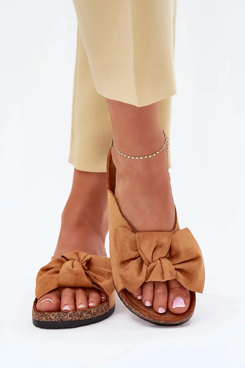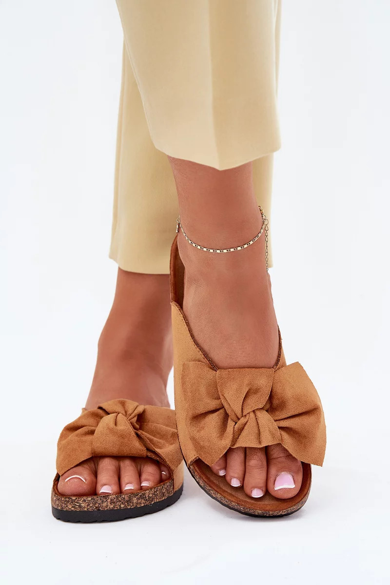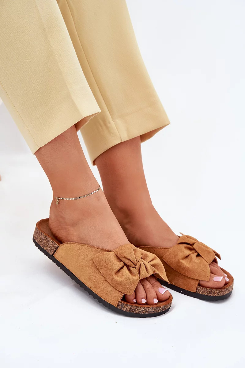 Dámské pantofle na korkové podešvi s mašlí – camel