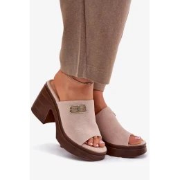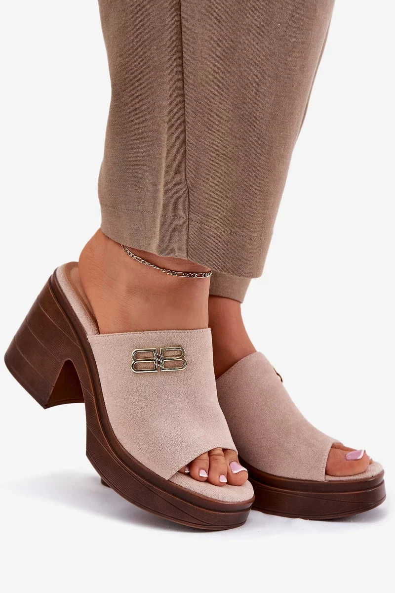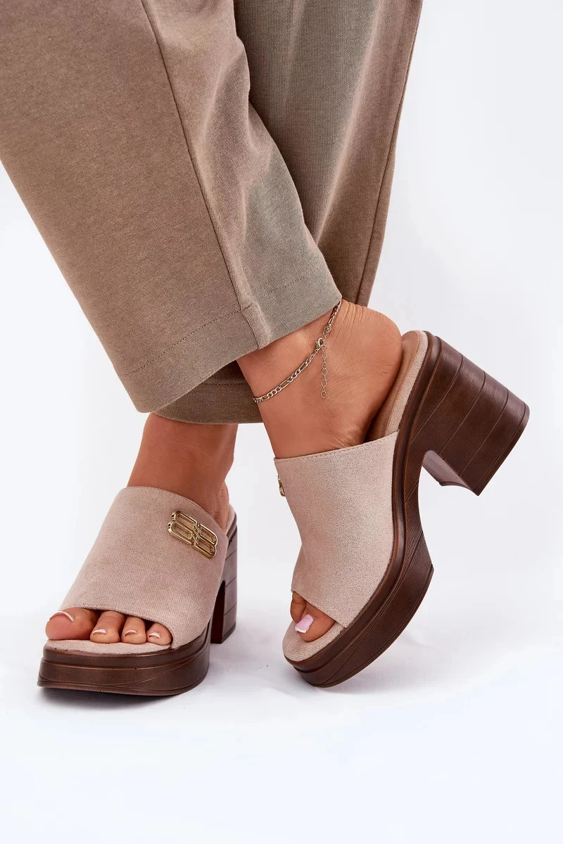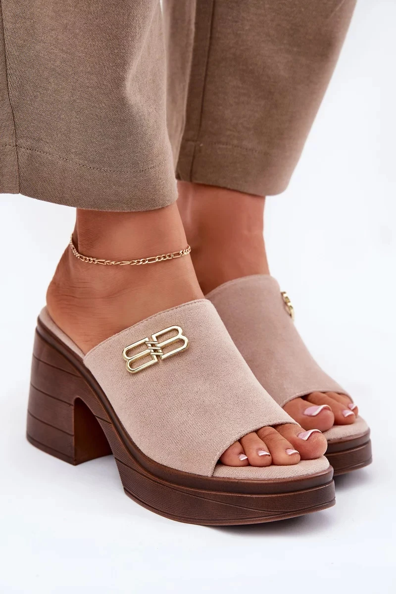 Dámské pantofle na masivním podpatku se zlatým detailem Vinceza – béžové