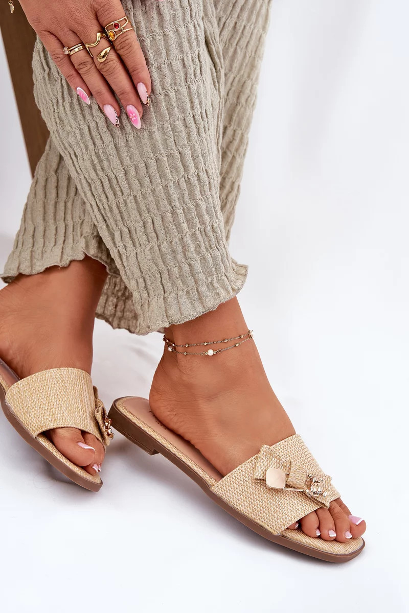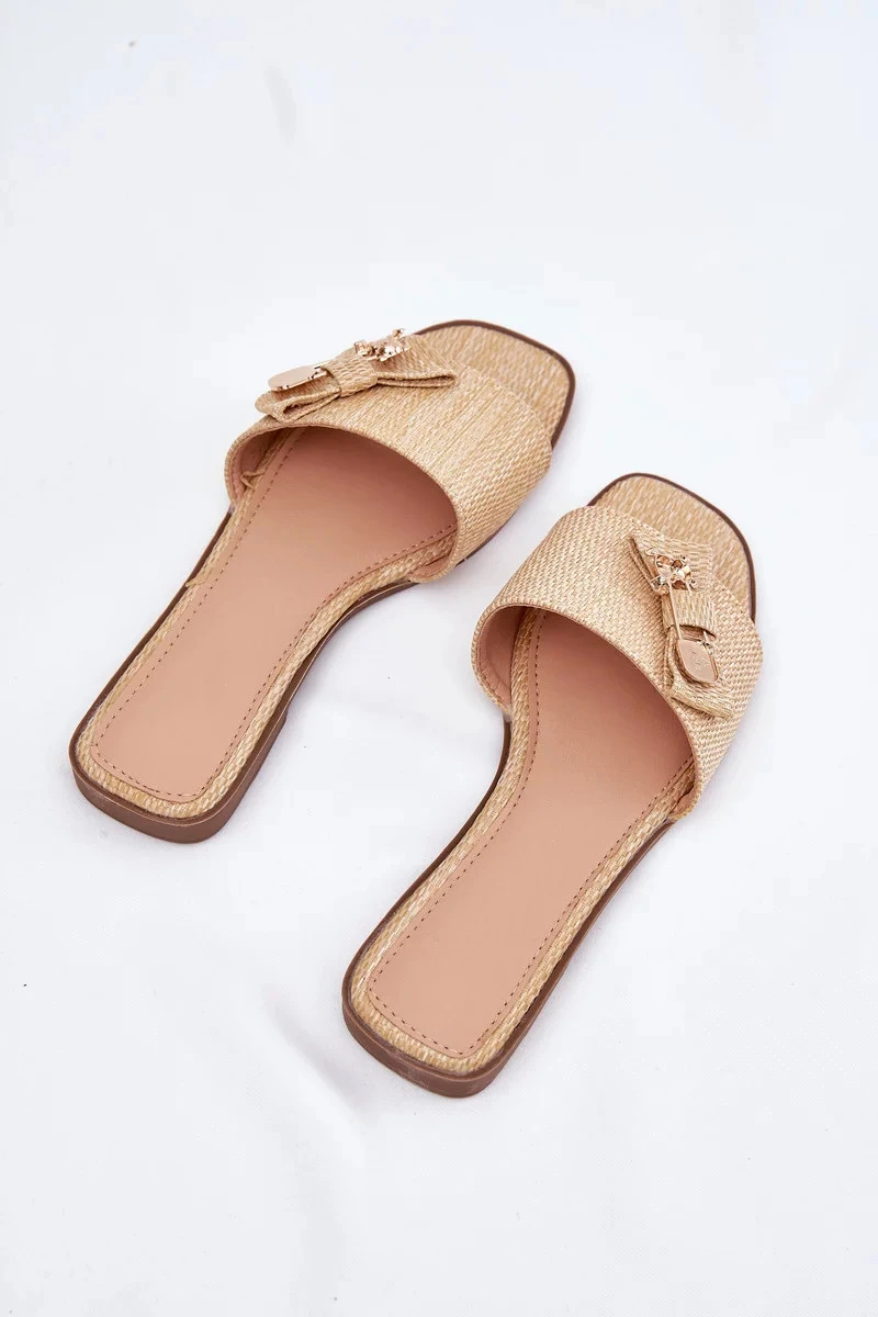 Béžové pantofle se hodí k neutrálním i pastelovým letním outfitům — skvěle doplní šaty, sukně i kalhoty.