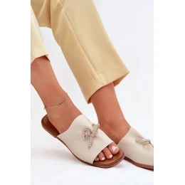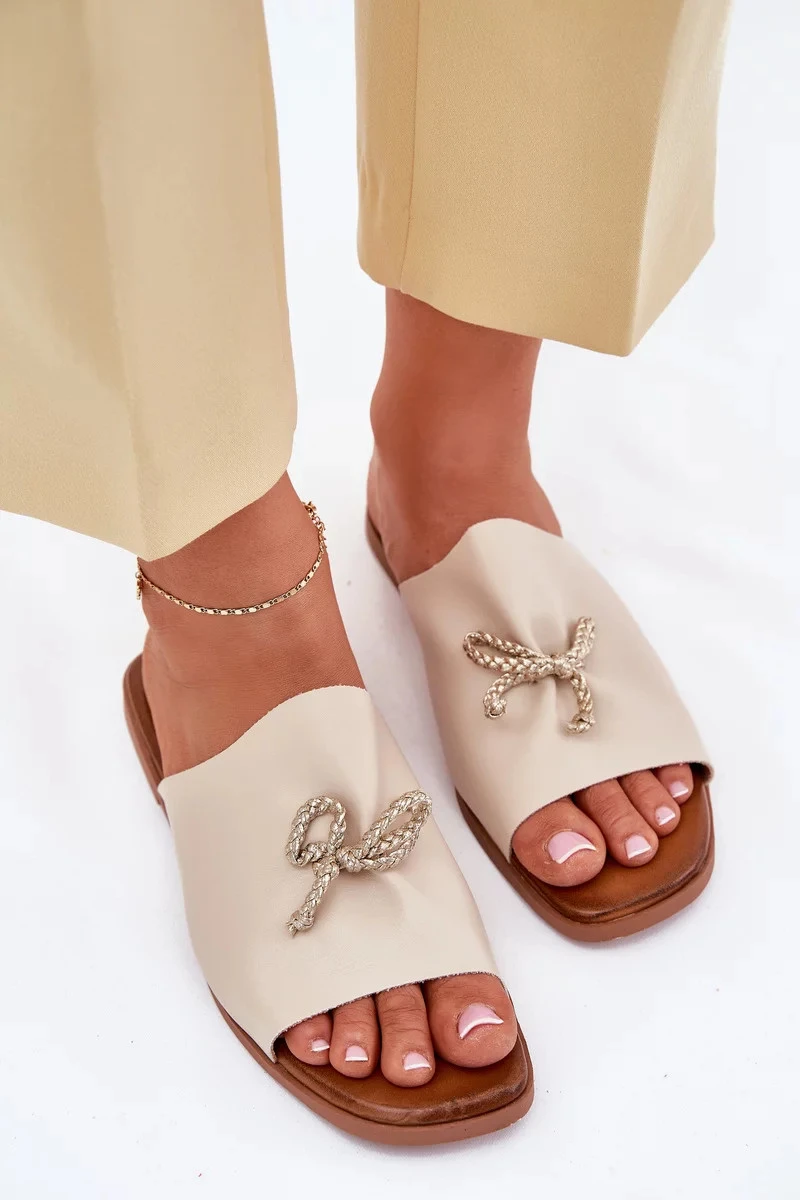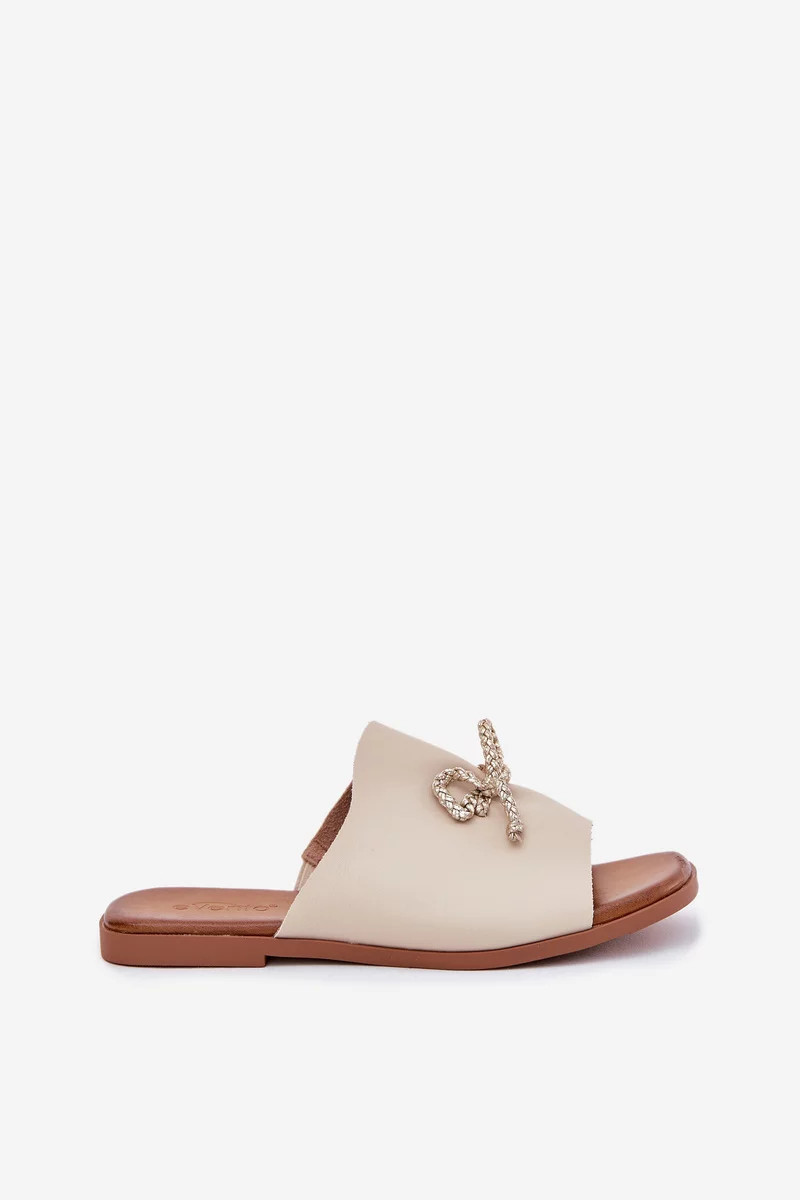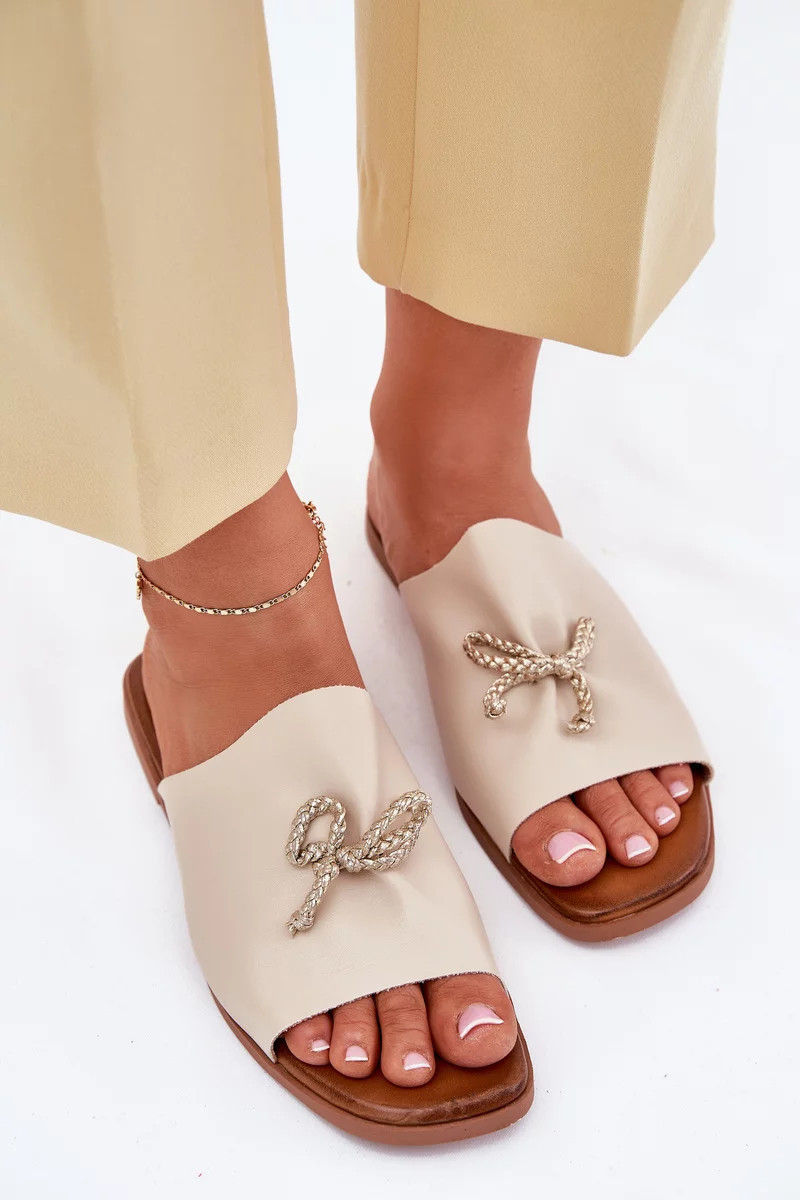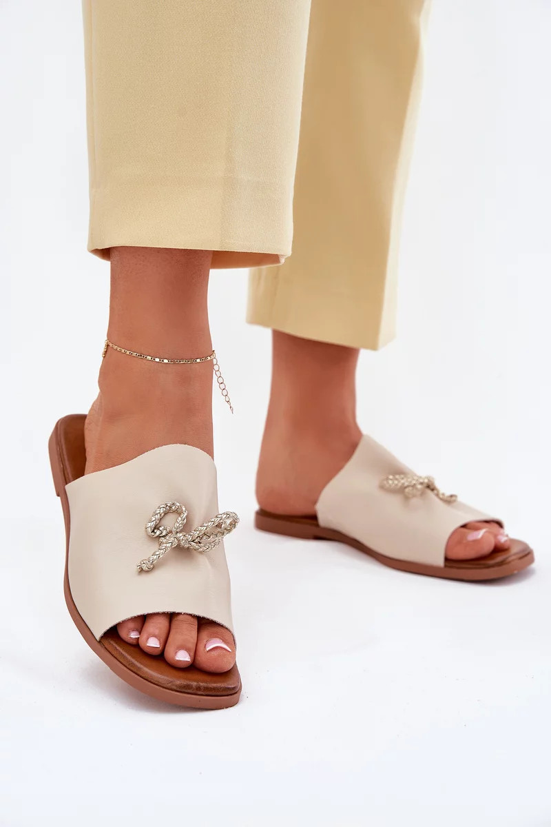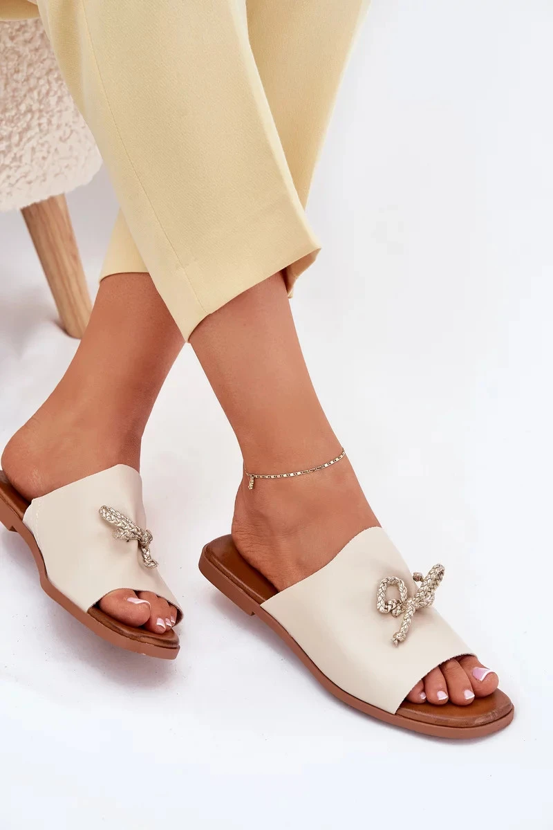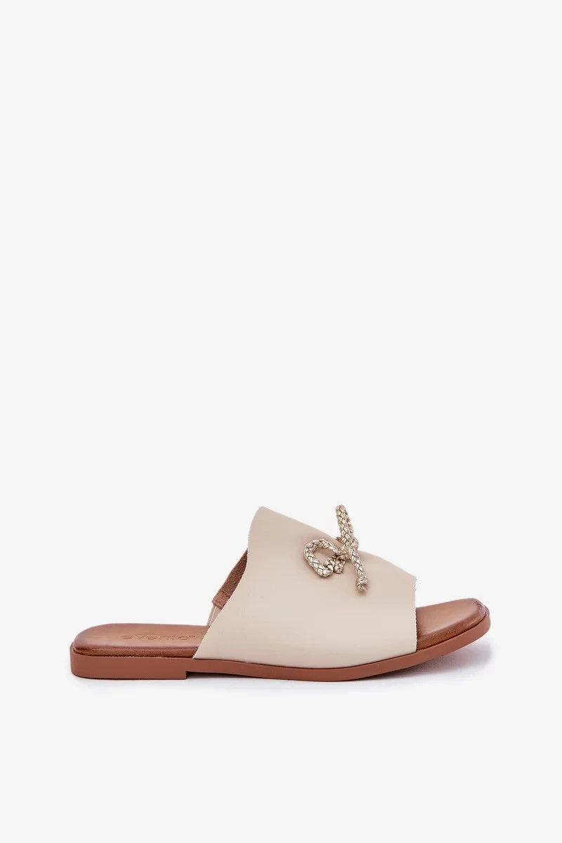 Dámské pantofle na nízkém podpatku s ozdobným vázáním – béžové Norela
