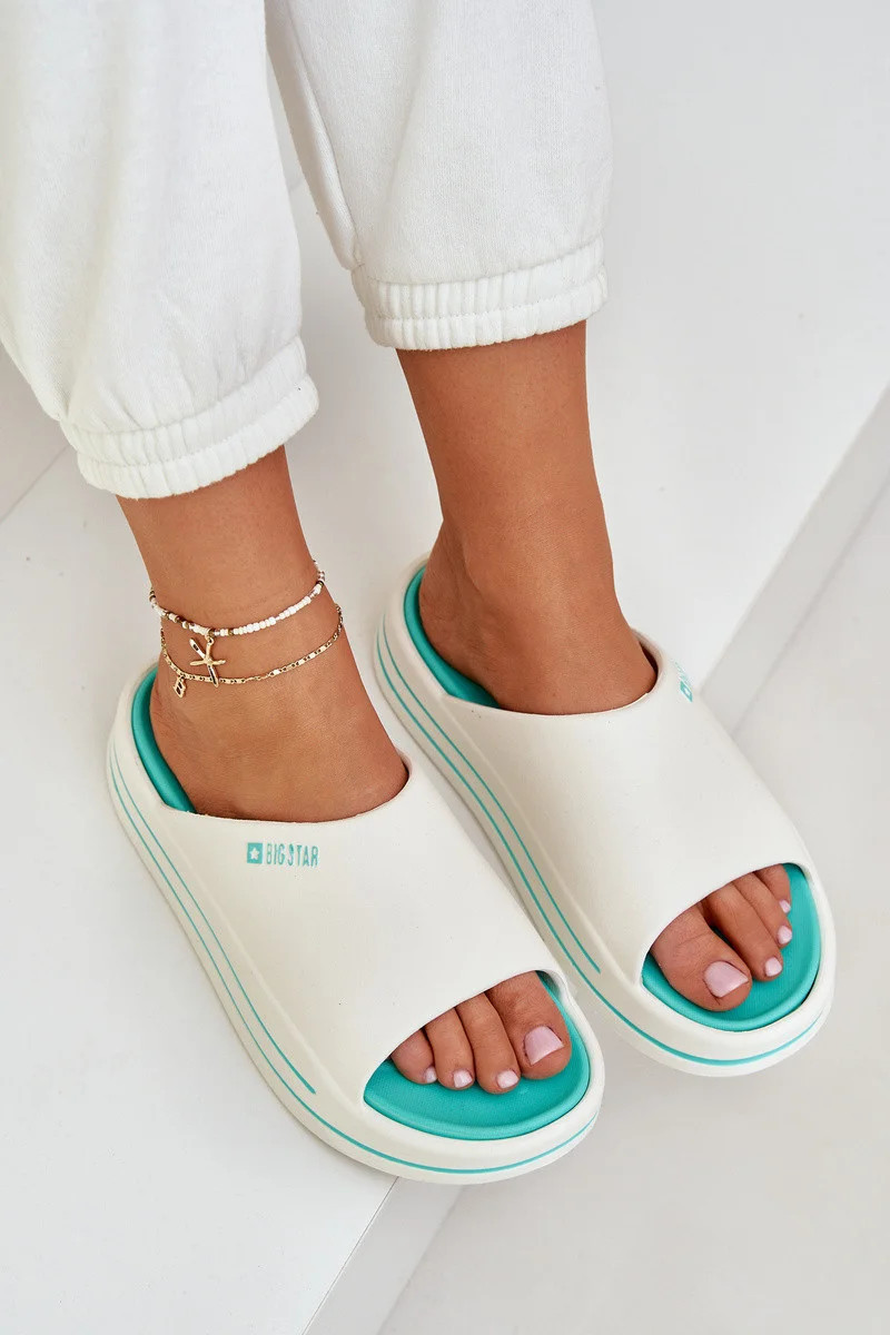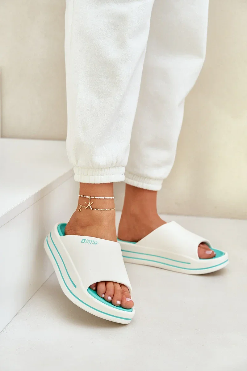 Stylové pantofle od značky Big Star v osvěžující kombinaci bílé a mátové barvy vás zaujmou nejen vzhledem, ale i pohodlím. Vyvýšená platforma dodá pár centimetrů navíc a zároveň zachová komfort při chůzi. Ideální pro letní městské procházky nebo odpočinek na dovolené.