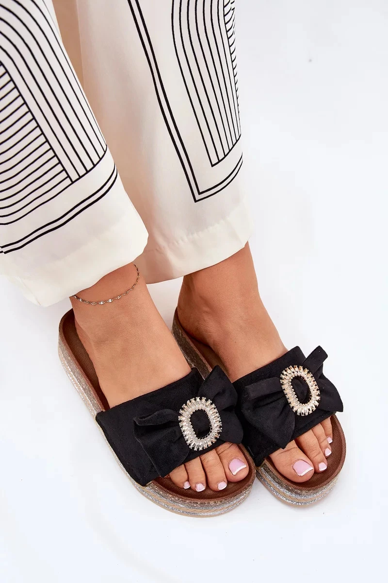 Dámské pantofle na platformě s mašlí a ozdobnou broží – černé Lenela