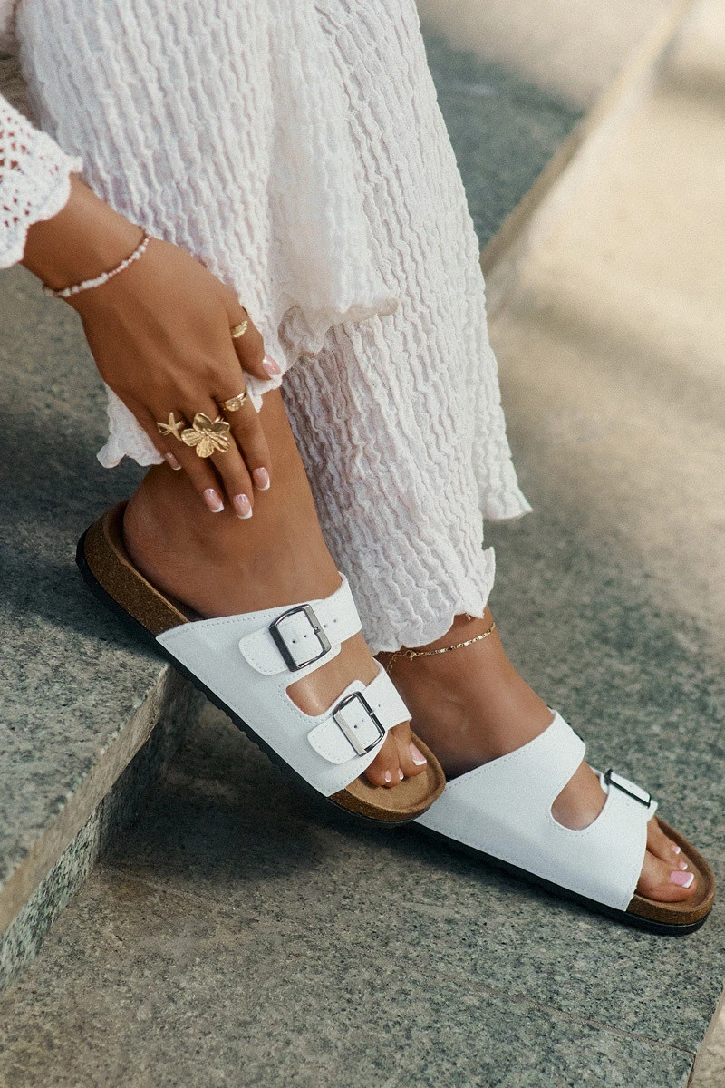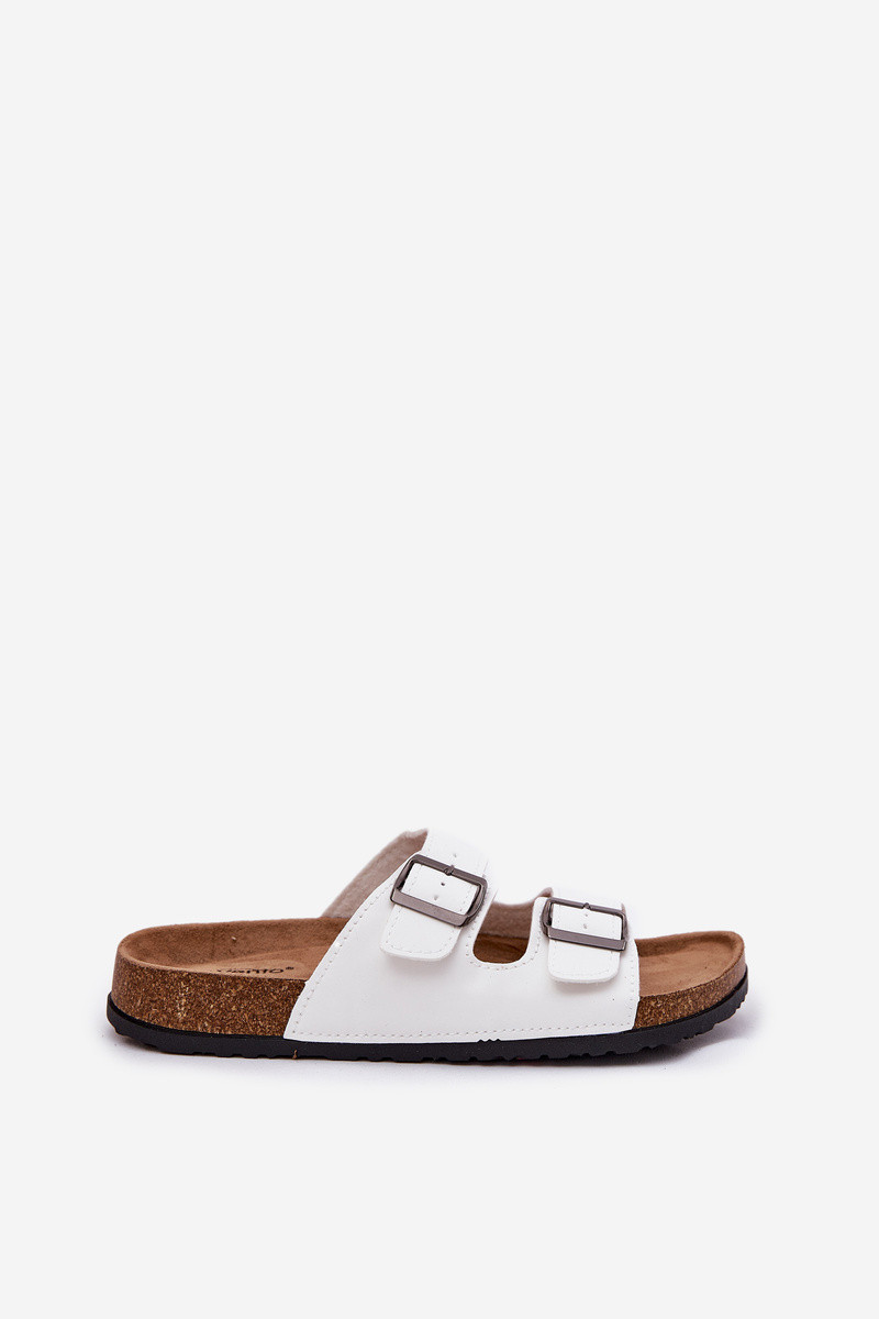 Dámské pantofle vyrobené z ekologické kůže. Dvě pásky s přezkami zajišťují snadné přizpůsobení noze a korková podrážka dodává lehkost a módní charakter. Profilovaná stélka zaručuje pohodlí po celý den, což dělá tyto pantofle ideální volbou na procházky nebo letní výlety. Komfort a styl v jednom! Při výběru velikosti se řiďte tabulkou velikostí.
