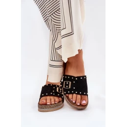 Stylové dámské pantofle z eko semiše, ozdobené sponou a hroty, které jim dodávají moderní a odvážný charakter. Usazené na platformě s třpytkami, které vnášejí do každé stylizace jemný lesk. Perfektní na letní dny, tyto pantofle kombinují pohodlí s módním vzhledem a skvěle se hodí k šatům, sukním a kalhotám. Při výběru velikosti se řiďte tabulkou velikostí.