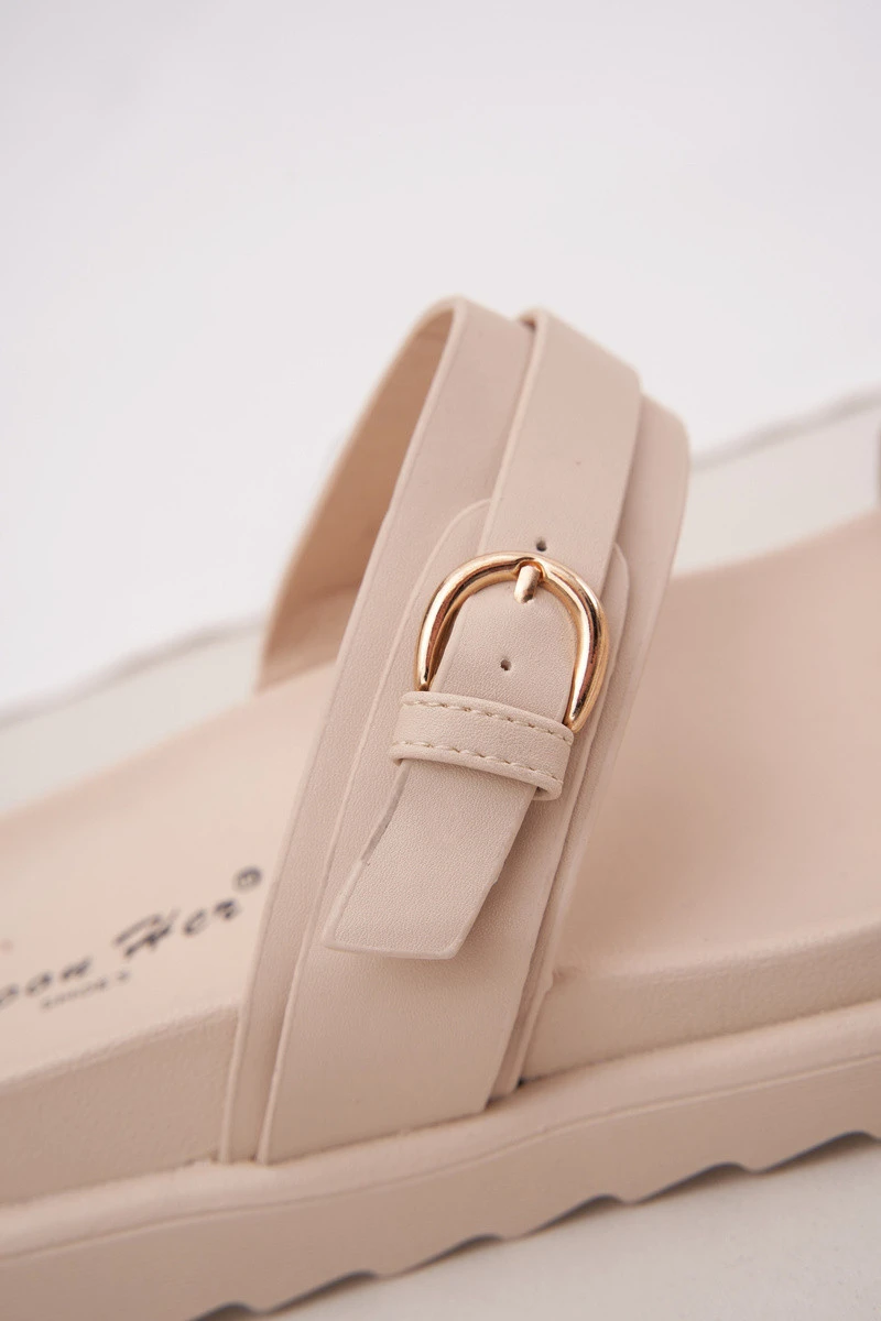 Módní dámské sandály na platformě, které spojují pohodlí s moderním vzhledem. Vpředu jsou dva pásky s přezkami, které dodávají charakter a jemně přitahují pozornost. Platforma zajišťuje jistotu kroku a stabilitu po celý den. Ideální na každodenní nošení, skvěle se hodí jak k šatům, tak k kalhotám, čímž vytvářejí univerzální prvek každého letního outfitu. Při výběru velikosti se řiďte tabulkou velikostí.