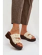 Dámské nazouváky vyrobené z textilního materiálu jsou stylovým a pohodlným návrhem na každý den. Model má dva pásky se zlatými přezkami, které zvýrazňují módní vzhled. Umístěny na platformě. Měkká vložka zvyšuje pohodlí i při delším nošení. Nazouváky jsou ideální pro letní stylizace, spojující funkčnost s elegantním vzhledem. Při výběru velikosti se řiďte tabulkou velikostí.
