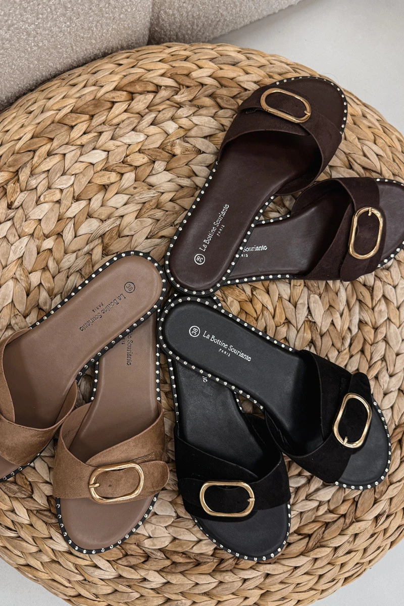 Dámské pantofle na ploché podrážce se zlatou sponou čokoládové model 21943479 - Boto