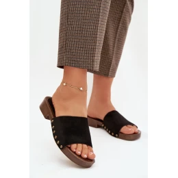 Dámské pantofle vyrobené z eko semiše jsou stylovou a pohodlnou volbou na každý den. Ploché podpatky zajišťují komfort při nošení a volnost při chůzi. Pás s ozdobnými zlatými nýty dodává celku módní a lehce elegantní charakter. Model se skvěle hodí do letních stylizací. Při výběru velikosti se řiďte tabulkou velikostí.