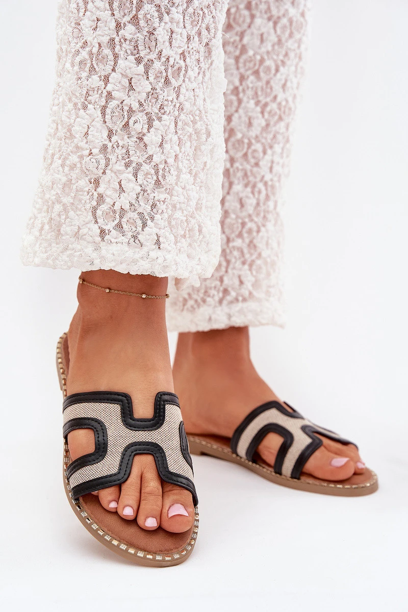 Dámské pantofle vyrobené z kombinace eko kůže a textilního materiálu, posazené na plochém podpatku, jsou pohodlnou nabídkou na každý den. Pod podrážkou se nachází zlatá ozdoba, která jim dodává jedinečný charakter. Měkká stélka zajišťuje pohodlí po celý den, takže pantofle jsou ideální pro každodenní a letní stylizace. Při výběru velikosti se řiďte tabulkou velikostí.