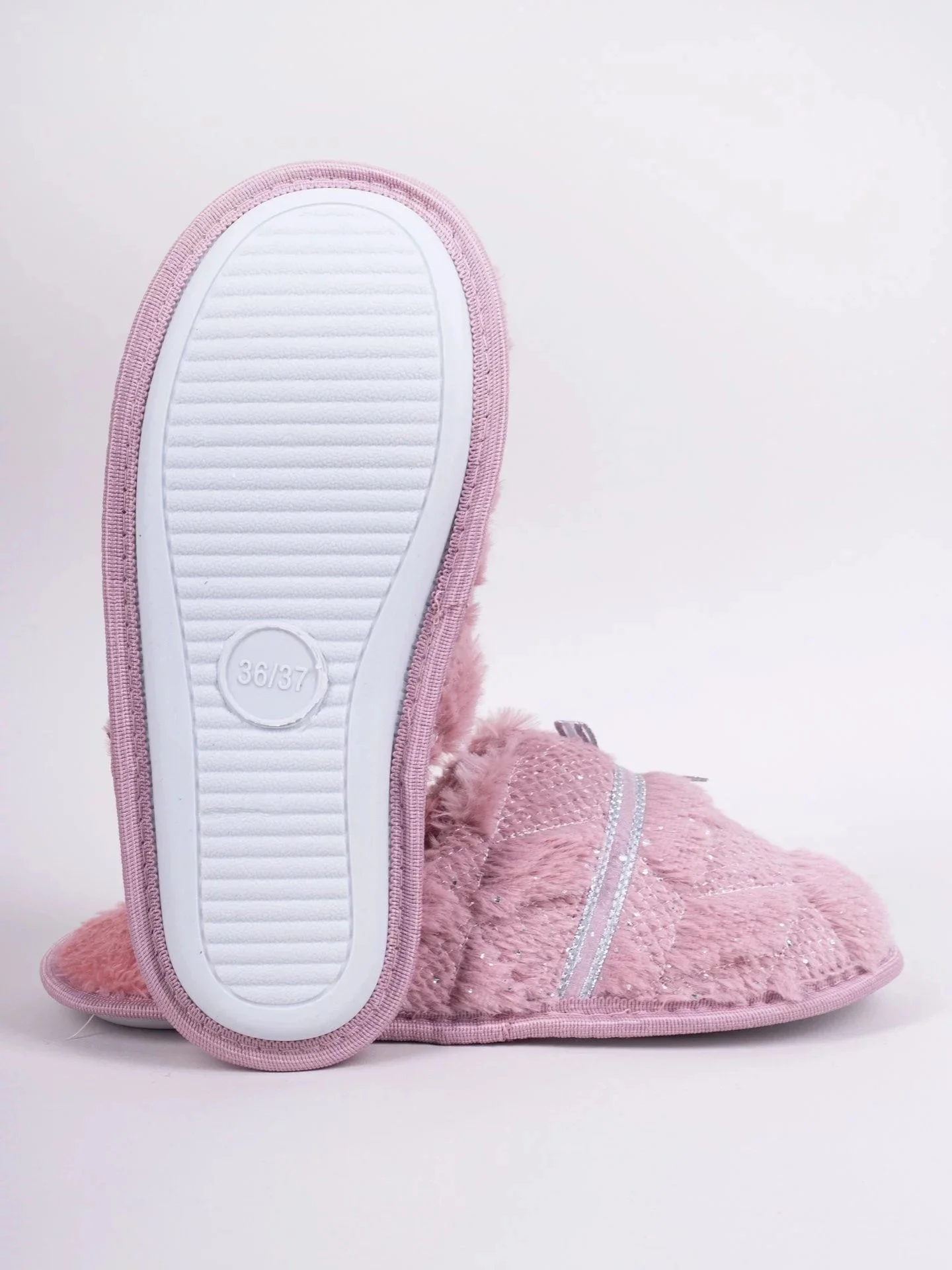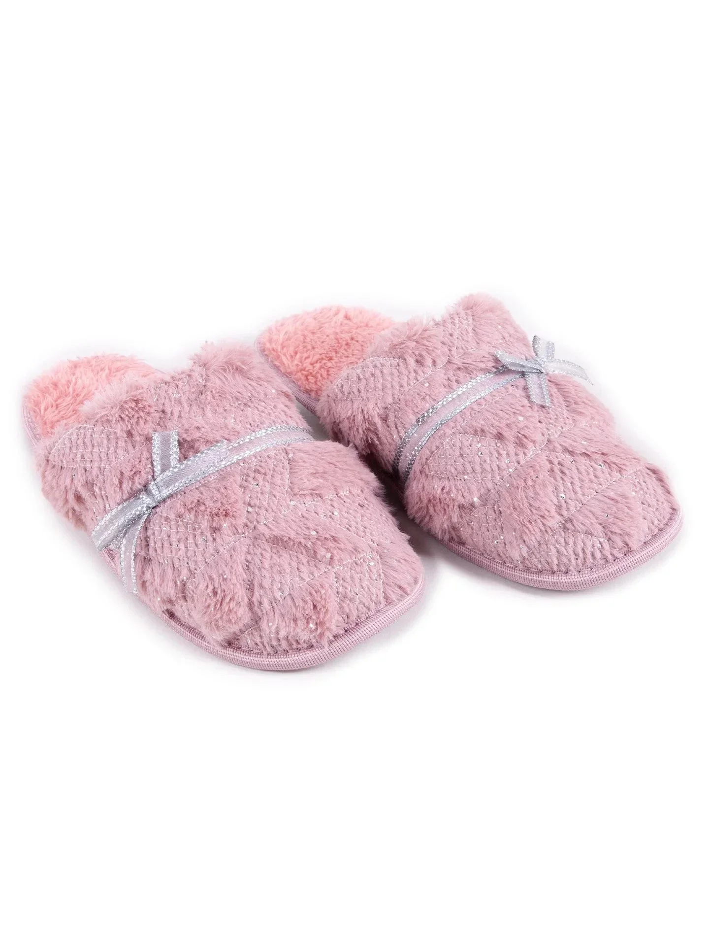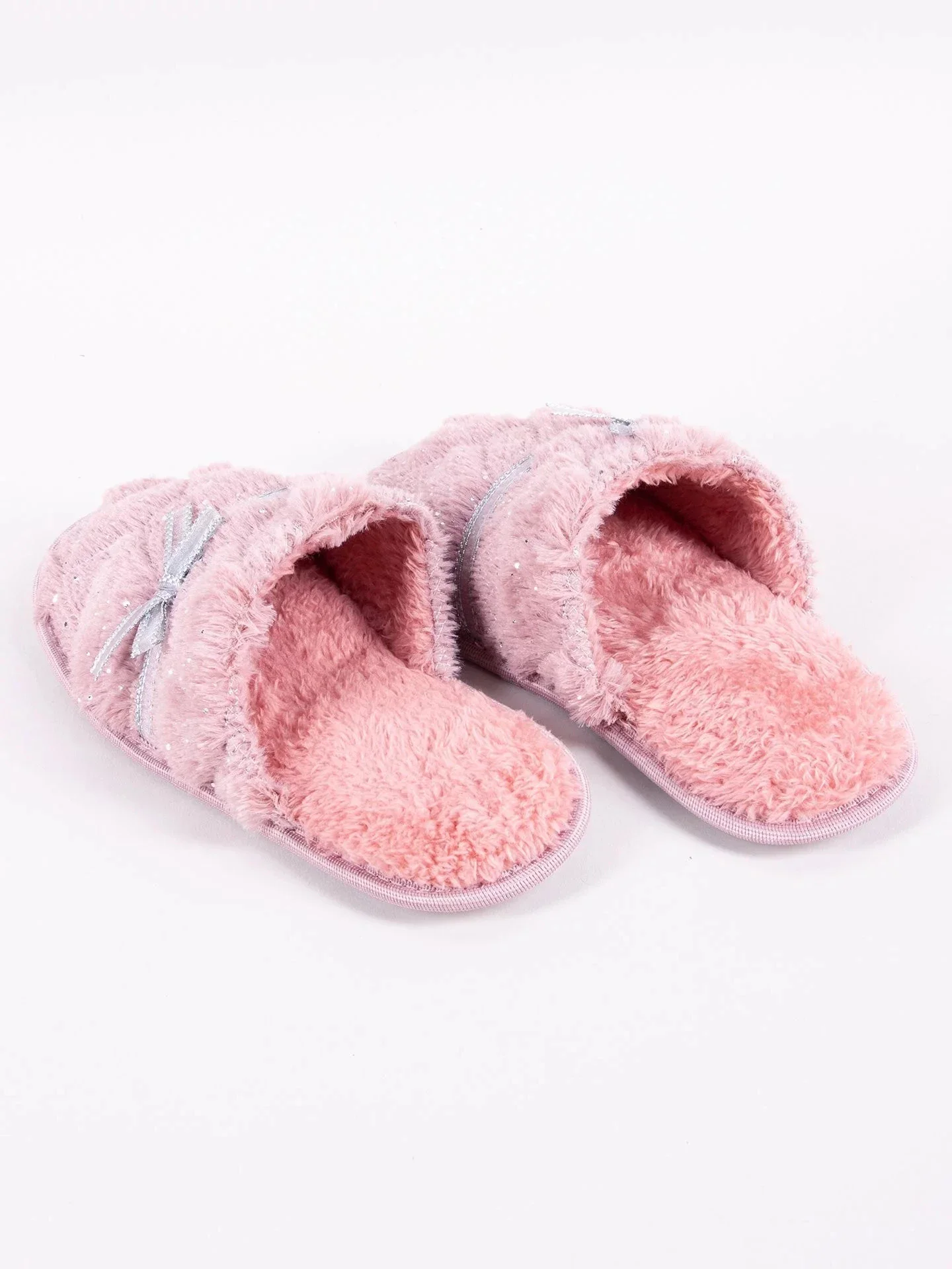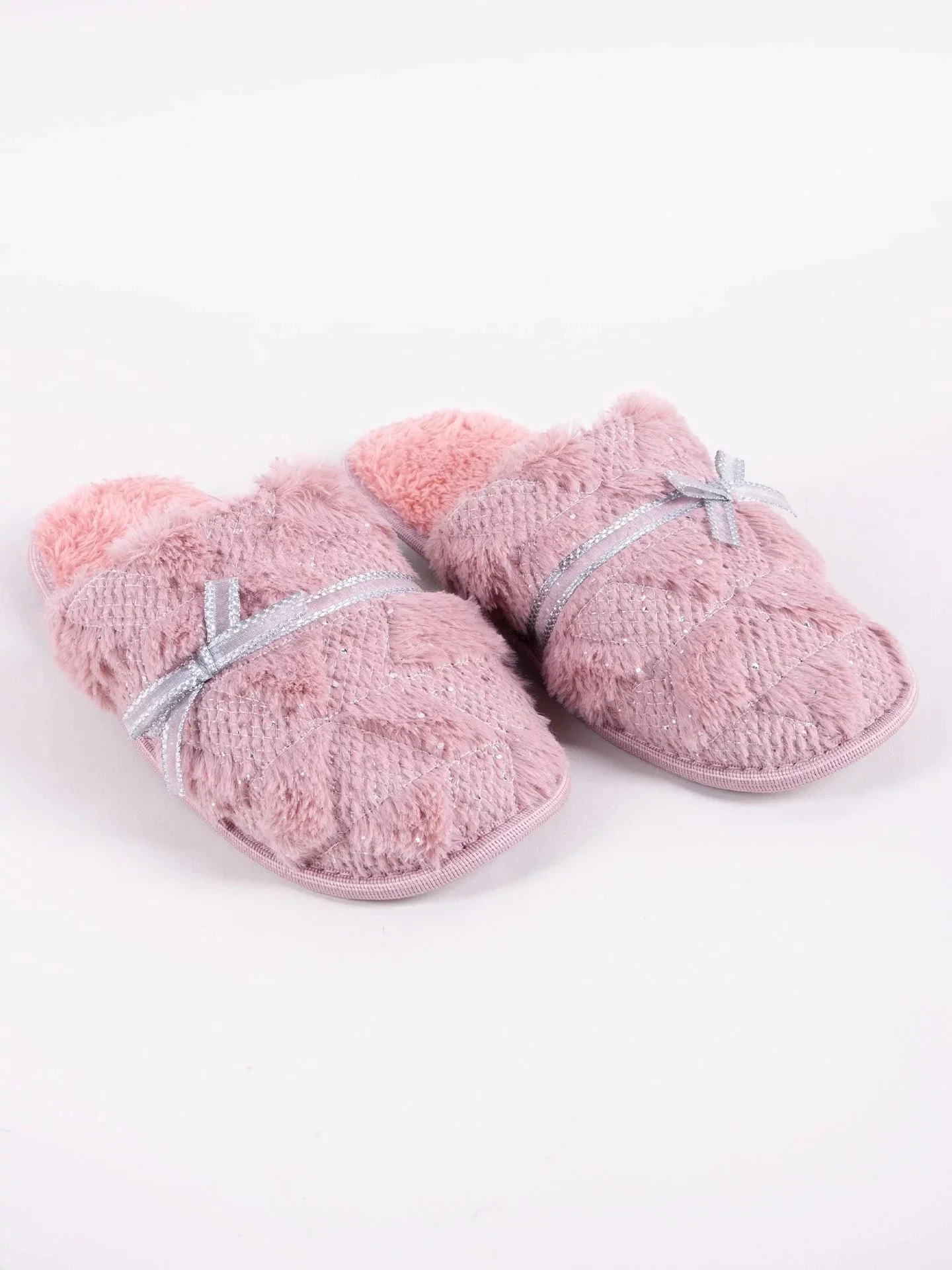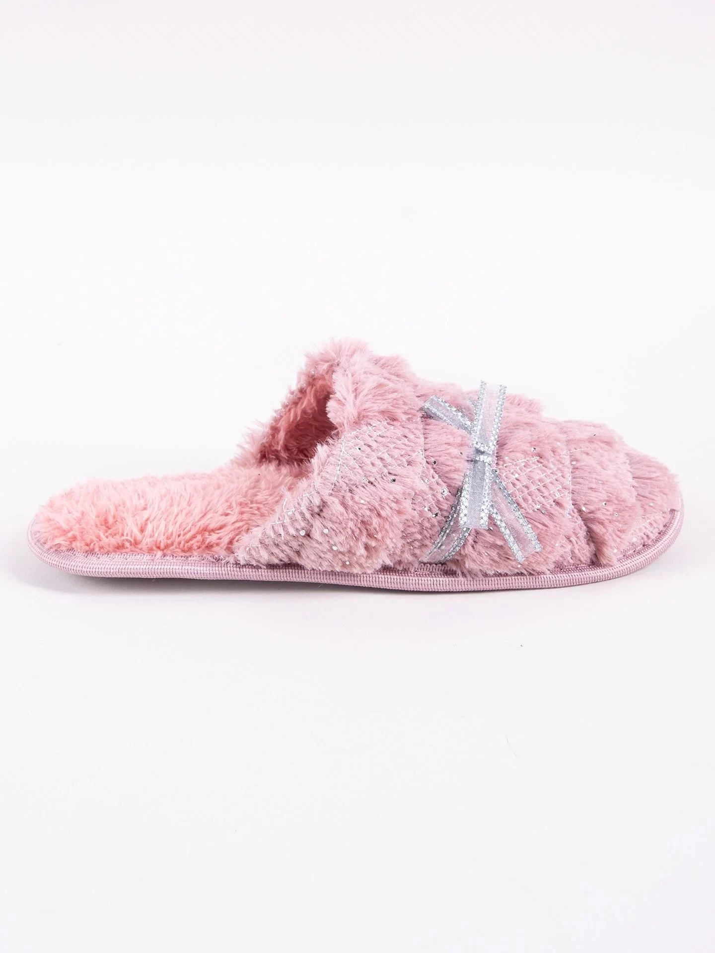 Domácí dámské pantofle v růžové barvě. Na přední straně je chlupatá, zdobená stříbrnou mašlí. Nazouvací, se zakrytými špičkami. Jsou praktické a pohodlné. Uvnitř jsou vycpané příjemnou kožešinou. Mají stabilní podrážku, takže jejich nošení je velmi pohodlné.