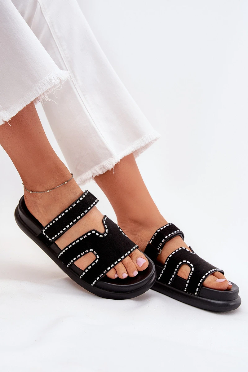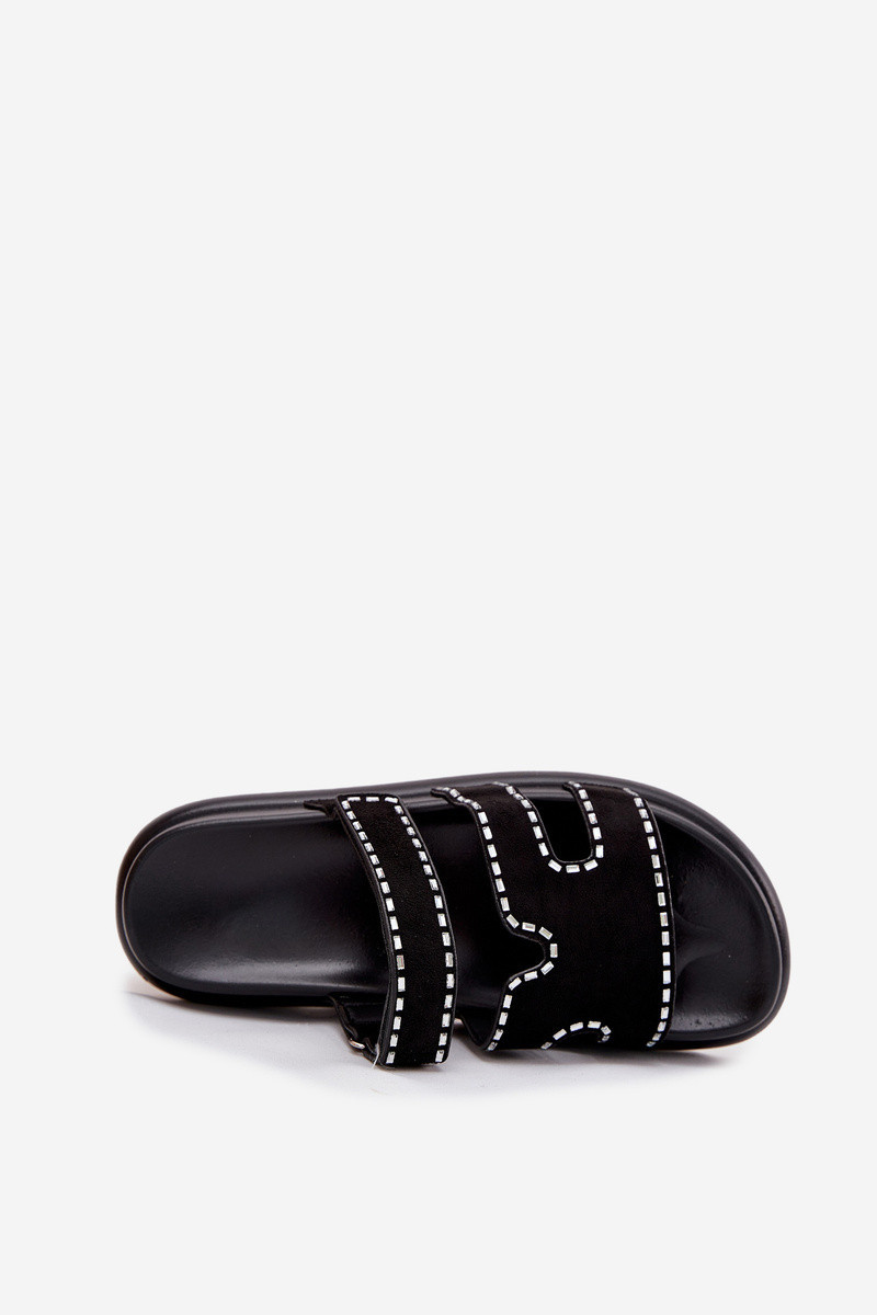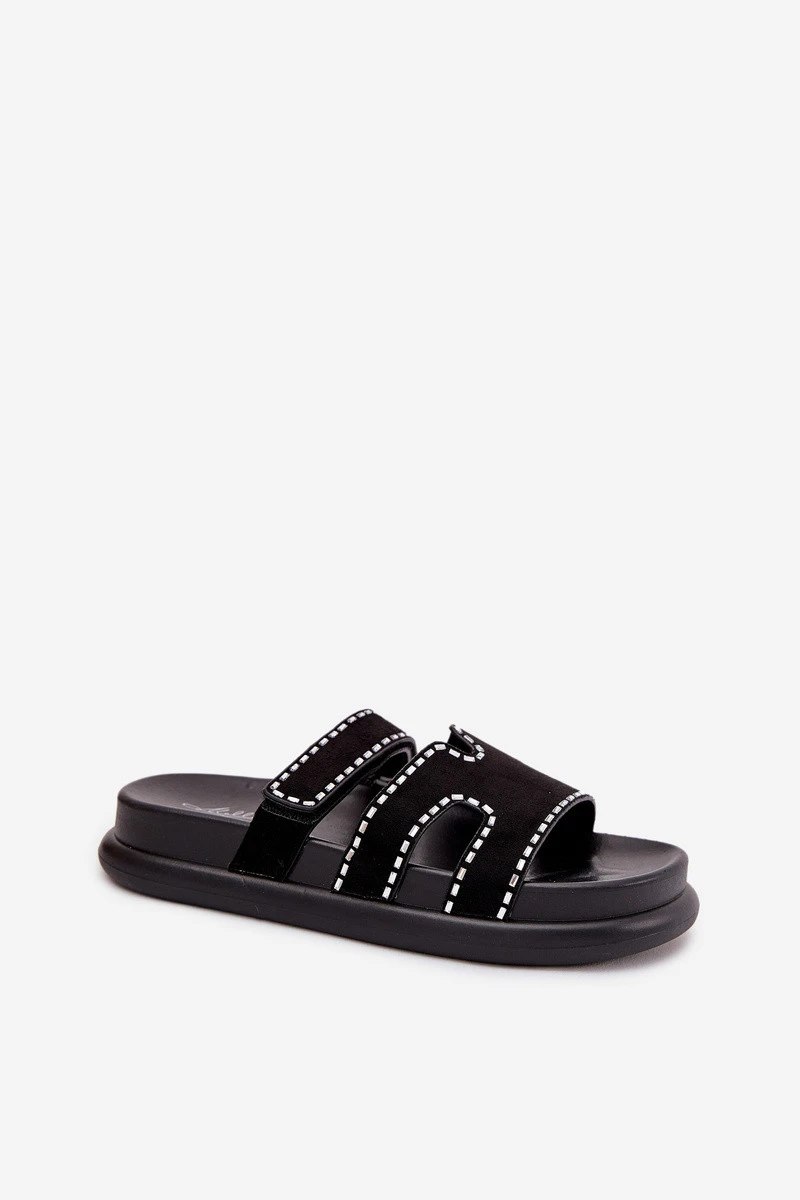 Dámské pantofle vyrobené z eko semiše. Umístěny na platformě. Ozdobení jim dodává jemný charakter a pásek se suchým zipem umožňuje snadné přizpůsobení noze, což zaručuje komfort po celý den. Skvělé na letní dny, skvěle se hodí k neformálním a každodenním stylizacím. Při výběru velikosti se řiďte tabulkou velikostí.