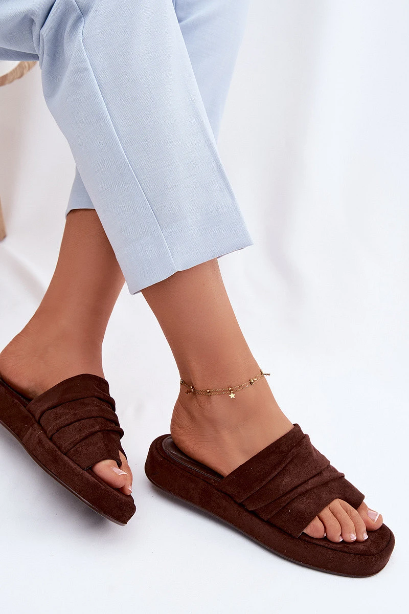 Stylové dámské pantofle vyrobené z měkkého eko semiše jsou ideální volbou na teplé dny, spojující pohodlí s módním vzhledem. Model na jemné platformě zajišťuje lehkost a komfort při chůzi a zároveň elegantně zvýrazňuje siluetu. Vypasovaný pásek tvoří efektní dekorativní prvek, který přitahuje pozornost a dodává výjimečný charakter. Ideální volba na každý den, pro procházky nebo letní výlety – pro ženy, které ocení styl a pohodlí v jednom. Při výběru velikosti se řiďte tabulkou velikostí.