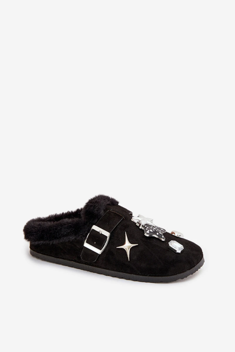 Dámské pantofle s ozdobami a sponou vyhřívané kožešinou černé model 21772637 - Boto