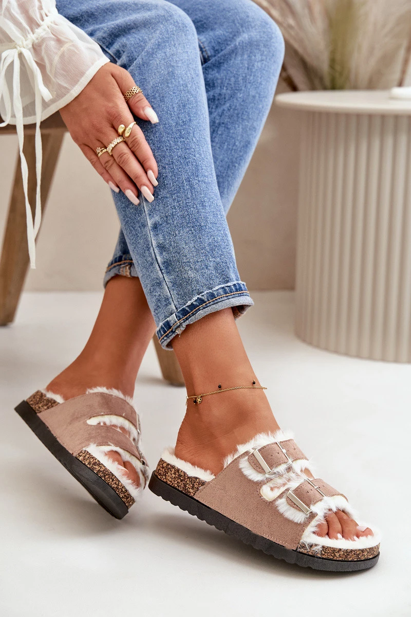 Dámské Pantofle S Přezkami A Kožíškem Béžové Ezilena
