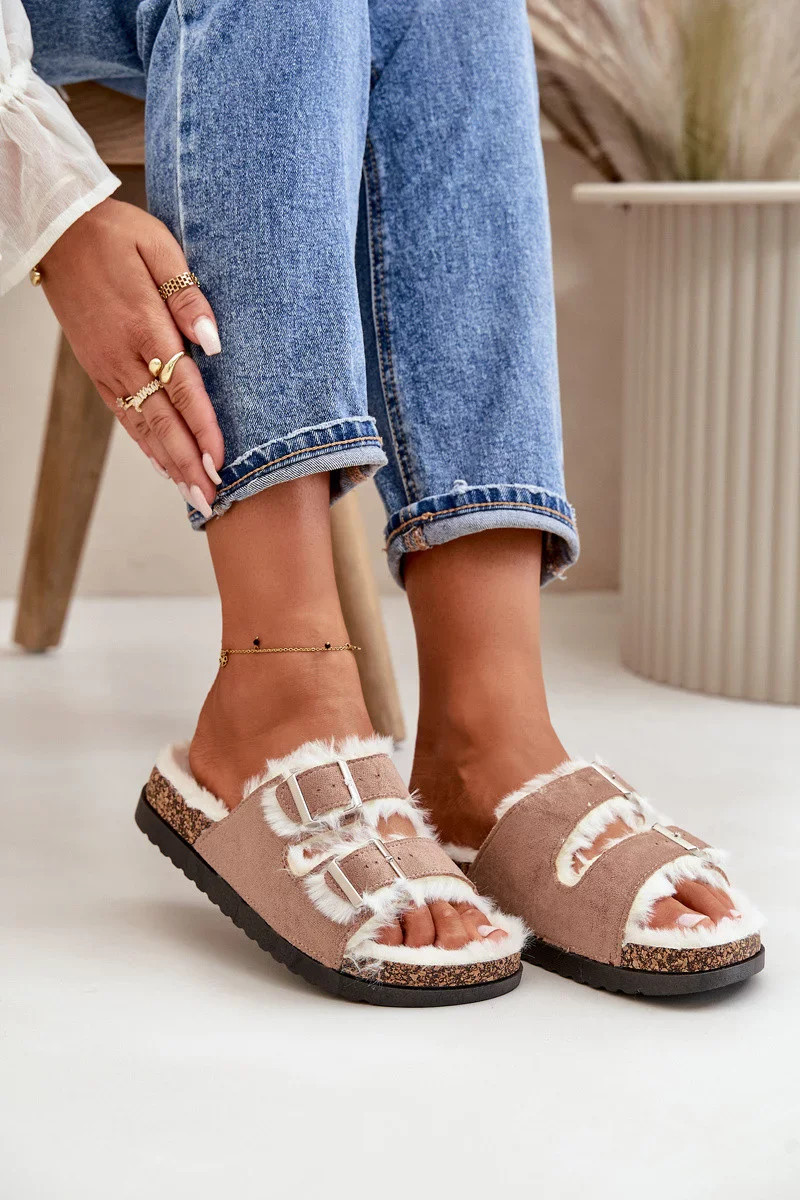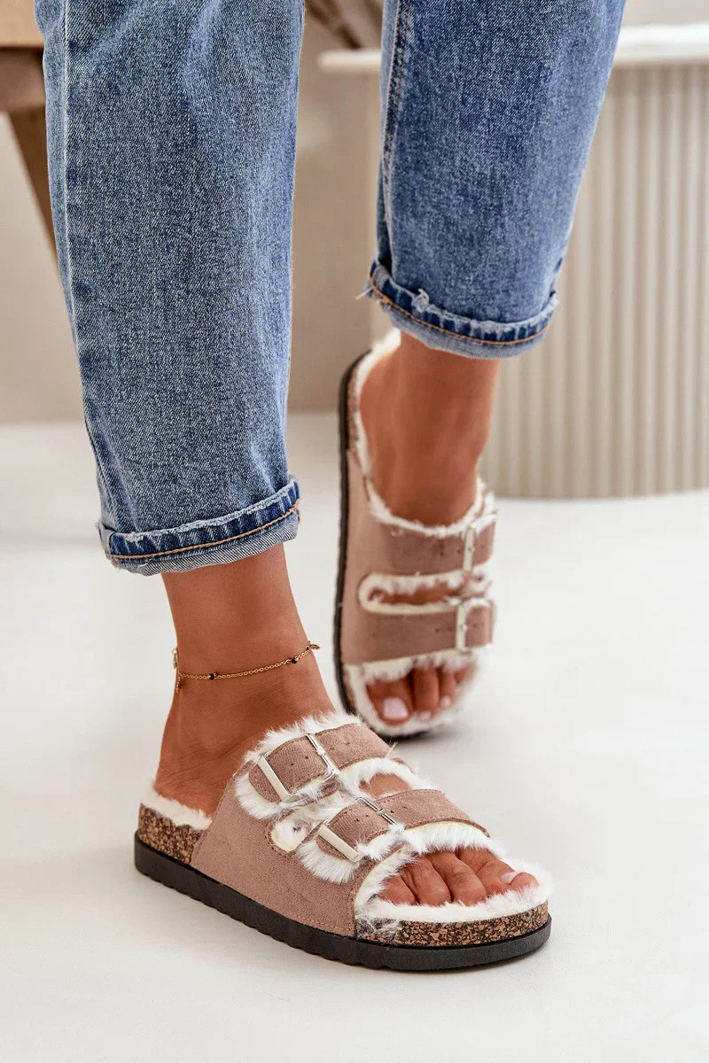 Dámské Pantofle S Přezkami A Kožíškem Béžové Ezilena