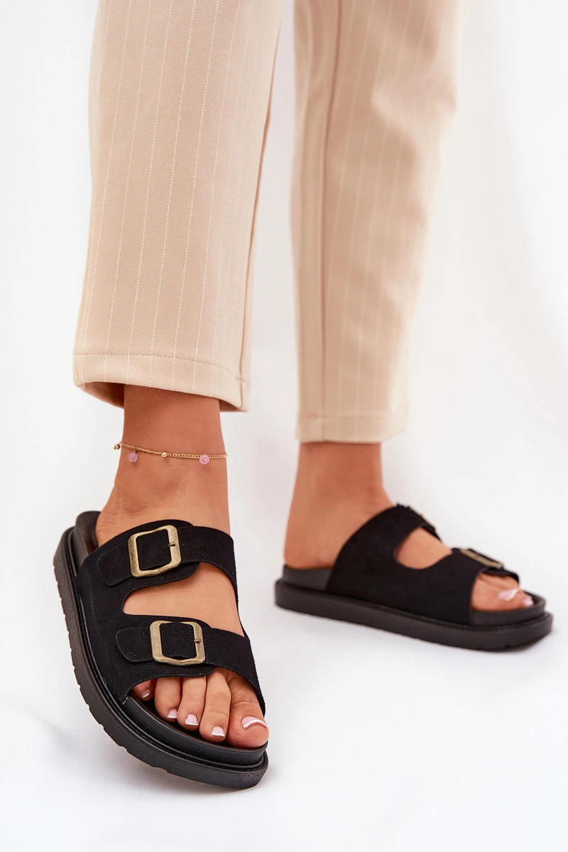 Stylové pantofle vyrobené z eko zamše. Umístěné na platformě, která spojuje pohodlí s módním vzhledem. Pásky s přezkami zajišťují dokonalé přizpůsobení a profilovaná stélka zaručuje komfort po celý den. Tyto pantofle budou skvělou volbou na letní dny, hodící se jak k šatům, tak k kalhotám. Při výběru velikosti se řiďte tabulkou velikostí.