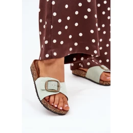 Dámské pantofle vyrobené z eko semiše. Usazené na korkové platformě. Vynikají sponou s nastavitelným páskem, který umožňuje dokonalé přizpůsobení noze. Profilovaná stélka zajišťuje pohodlí po celý den a jejich jednoduchý vzhled je činí ideálními pro každodenní styling. Ideální na letní dny, hodí se k šatům, sukním nebo kalhotám, vnášejí lehkost a styl do každého outfitu. Při výběru velikosti se řiďte tabulkou velikostí.