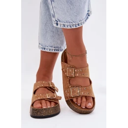 Dámské pantofle vyrobené z eko semiše jsou stylovým a pohodlným tipem na teplé dny. Korková platforma zajišťuje komfort nošení a přirozený letní charakter. Model je ozdoben zlatými přezkami a nýty, které dodávají celku módní a výrazný akcent. Pantofle se skvěle hodí do každodenních outfitů, vhodné jak k šatům, tak k casualovým sadám. Při výběru velikosti se řiďte tabulkou velikostí.
