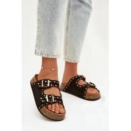 Dámské pantofle vyrobené z eko semiše jsou stylovým a pohodlným tipem na teplé dny. Korková platforma zajišťuje komfort nošení a přirozený letní charakter. Model je ozdoben zlatými přezkami a nýty, které dodávají celku módní a výrazný akcent. Pantofle se skvěle hodí do každodenních outfitů, vhodné jak k šatům, tak k casualovým sadám. Při výběru velikosti se řiďte tabulkou velikostí.