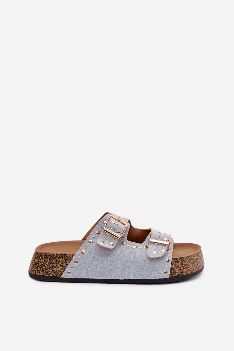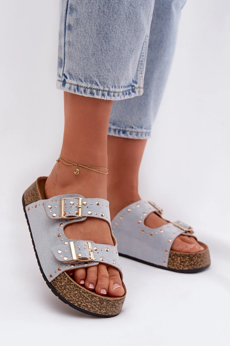Dámské pantofle vyrobené z eko semiše jsou stylovým a pohodlným tipem na teplé dny. Korková platforma zajišťuje komfort nošení a přirozený letní charakter. Model je ozdoben zlatými přezkami a nýty, které dodávají celku módní a výrazný akcent. Pantofle se skvěle hodí do každodenních outfitů, vhodné jak k šatům, tak k casualovým sadám. Při výběru velikosti se řiďte tabulkou velikostí.