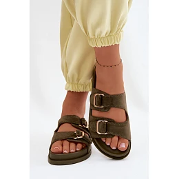 Stylové dámské nazouváky z imitace semiše jsou ideální volbou na teplé dny. Skvěle ladí s mnoha letními outfity. Model se vyznačuje ozdobnými zlatými přezkami, které dodávají celku elegantní a módní vzhled. Měkká textura materiálu zajišťuje pohodlí při nošení a pohodlný střih dělá z nich ideální obuv na každý den. Při výběru velikosti se řiďte tabulkou velikostí.