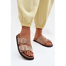 Dámské pantofle z imitace semiše s zlatými přezkami tmavě béžové Selissea