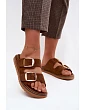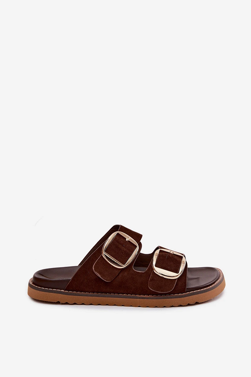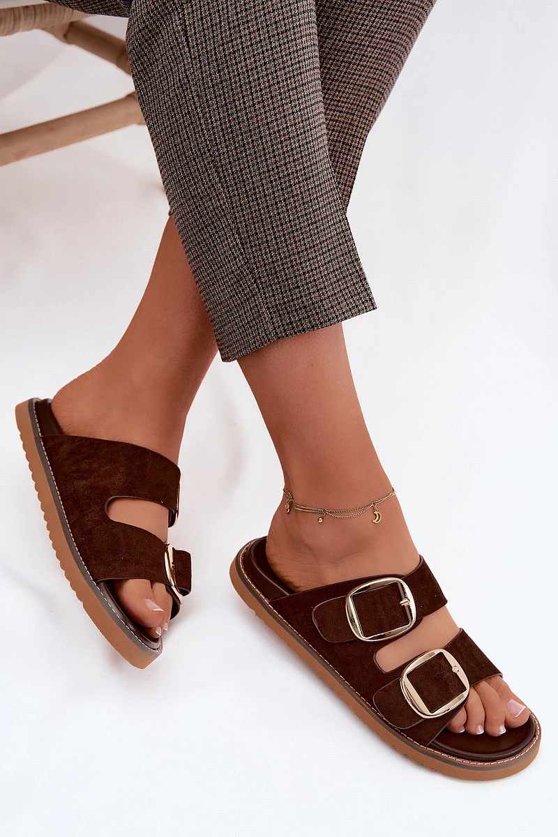 Dámské pantofle z imitace semiše se zlatými přezkami čokoládové Averia