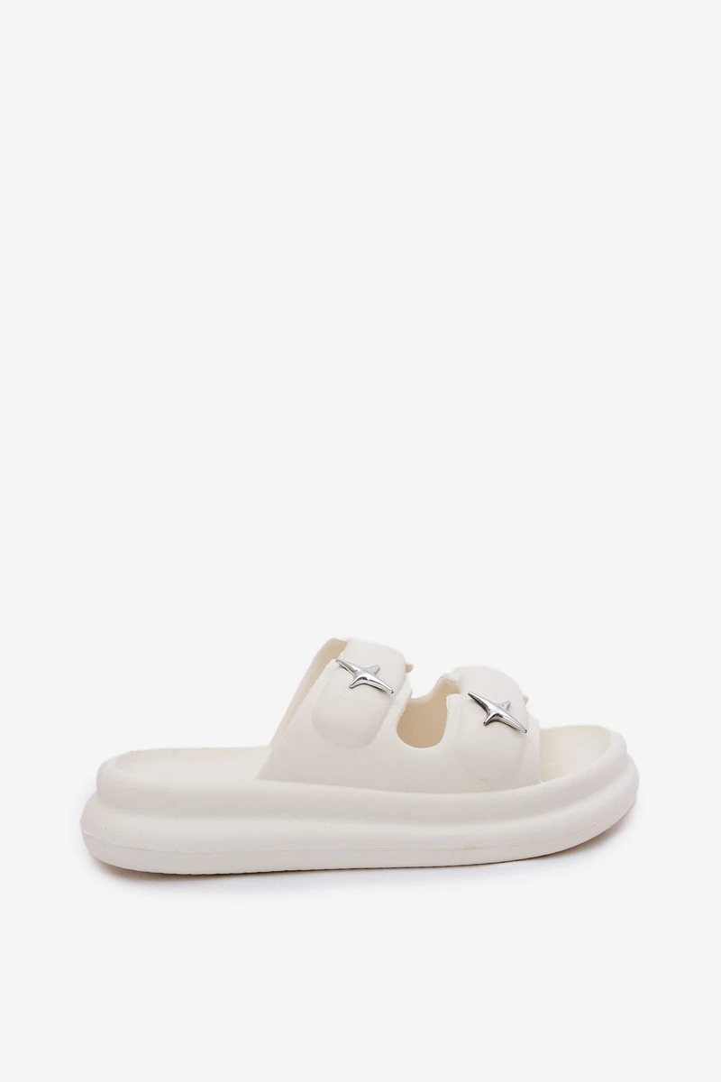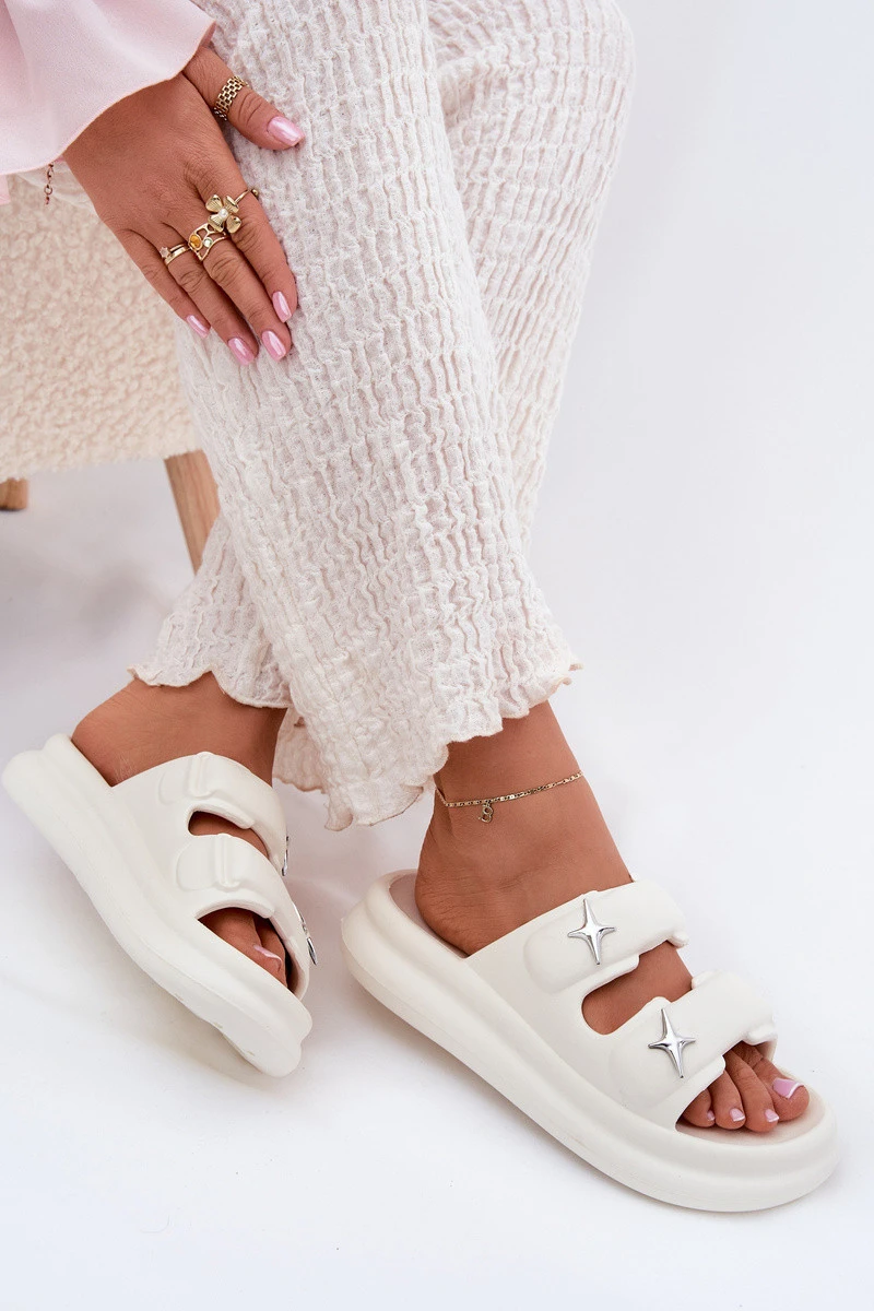 Dámské pantofle z pěnového materiálu, lehké a na platformě, jsou skvělou volbou na teplé dny. Dvě pásky ozdobené stříbrnými brožemi jim dodávají módní charakter. Ideální na bazén, každodenní výlety a letní dovolenou. Při výběru velikosti se řiďte tabulkou velikostí.