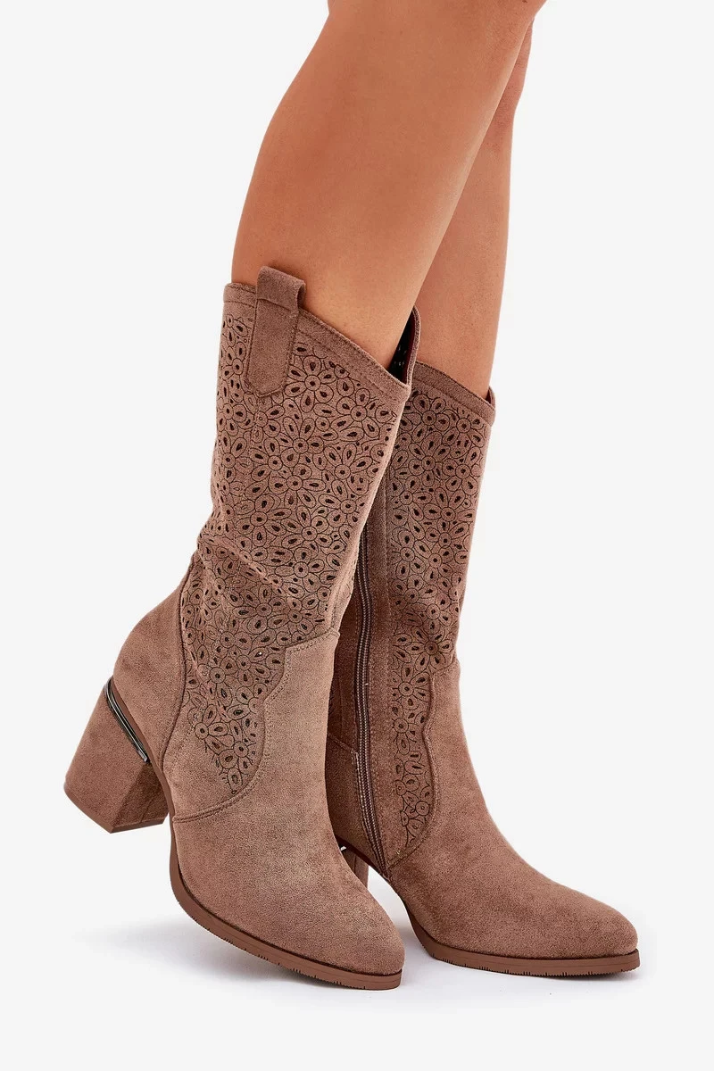 Dámské perforované kozačky do poloviny lýtka ve stylu kovbojek S.Barski – hnědé, eko kůže