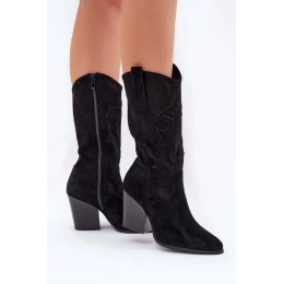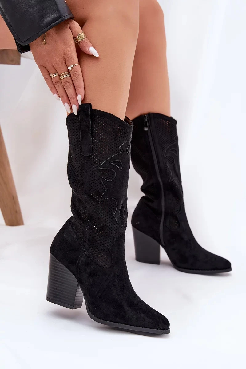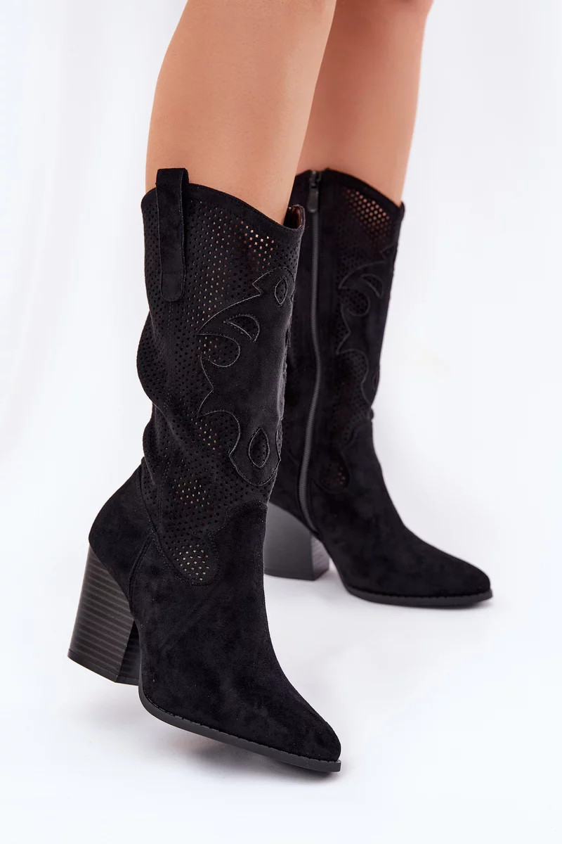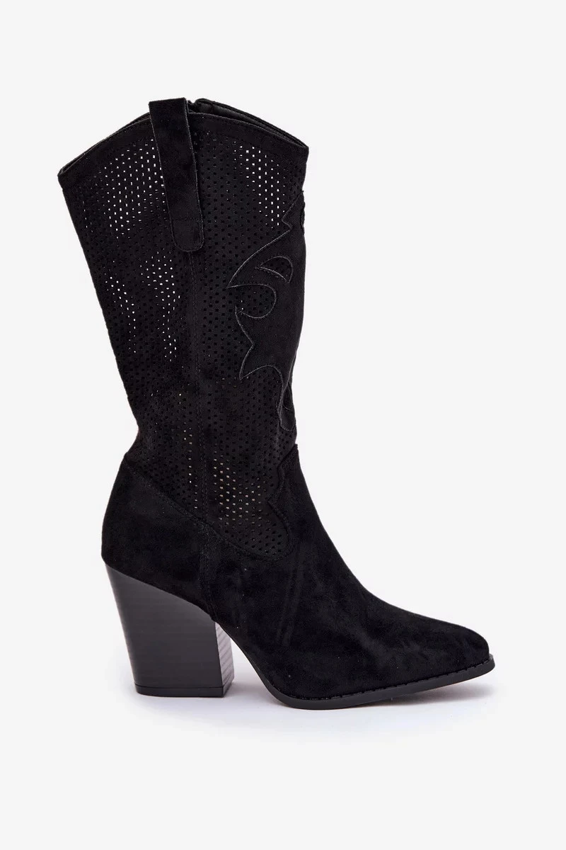Dámské perforované kozačky ve stylu kovbojek na sloupkovém podpatku S.Barski – černé, eko kůže