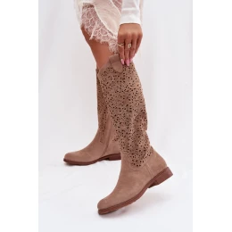 Dámské perforované vysoké kozačky na nízkém podpatku model 21998055 Béžové - S.Barski