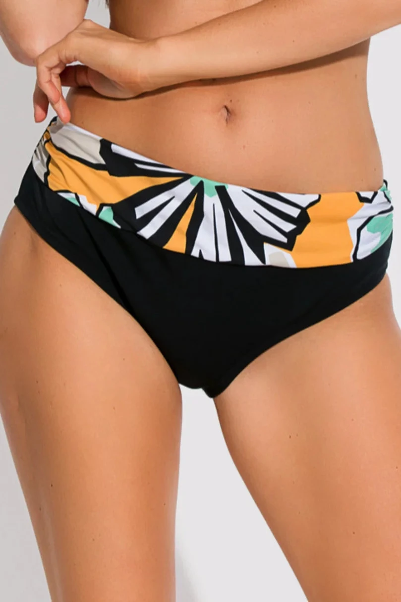Koupací kalhotky klasického střihu, řasení v horní části ze vzorovaného mikrovlákna, spodní a zadní část z hladkého černého materiálu.