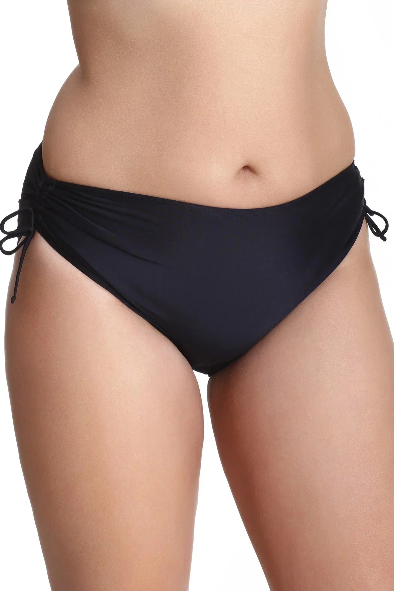 Černé plavkové kalhotky mají šňůrky na bocích pro nastavení výšky kalhotek.