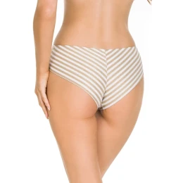 Vrchní část kalhotek je vyrobená ze zlatého mikrovlákna a je nařasená. Spodní část modelu a zadní díl jsou pruhované a ozdobené zlatou přízí. Střih modelu zakrývá nedokonalosti postavy. Kalhotky krásně zvýrazňují opálení.