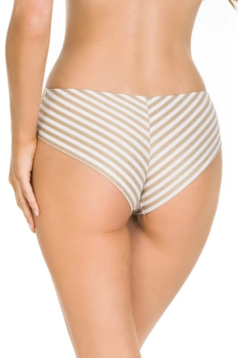 Vrchní část kalhotek je vyrobená ze zlatého mikrovlákna a je nařasená. Spodní část modelu a zadní díl jsou pruhované a ozdobené zlatou přízí. Střih modelu zakrývá nedokonalosti postavy. Kalhotky krásně zvýrazňují opálení.