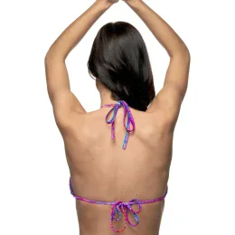 Dámské plavky značky FANTASY z kolekce Amy. Podprsenka má trojúhelníkové košíčky bez kostic s vyjímatelnou lehkou výztuhou. Ramínka jsou součástí vnějšího lemu košíčků a jsou na zavazování za krkem. Obvod je tvořen šňůrkou, která je provlečena spodní částí košíčků. Zavazuje se na zádech, lze díky němu regulovat vzdálenost košičků i délku obvodu. K podprsence lze kombinovat jakékoliv kalhotky ze stejné kolekce.