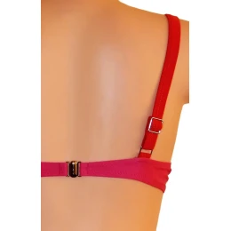 Dámské dvoudílné plavky bikiny ve dvoubarevném provedení. Barvy jsou v červeném odstínu (tmavší a světlejší), viz. obrázky. Podprsenka je vybavena polstrovanými košíčky a kosticemi. Polstrování nelze odejmout. Ramínka jsou nastavitelná a taktéž je nelze odejmout.