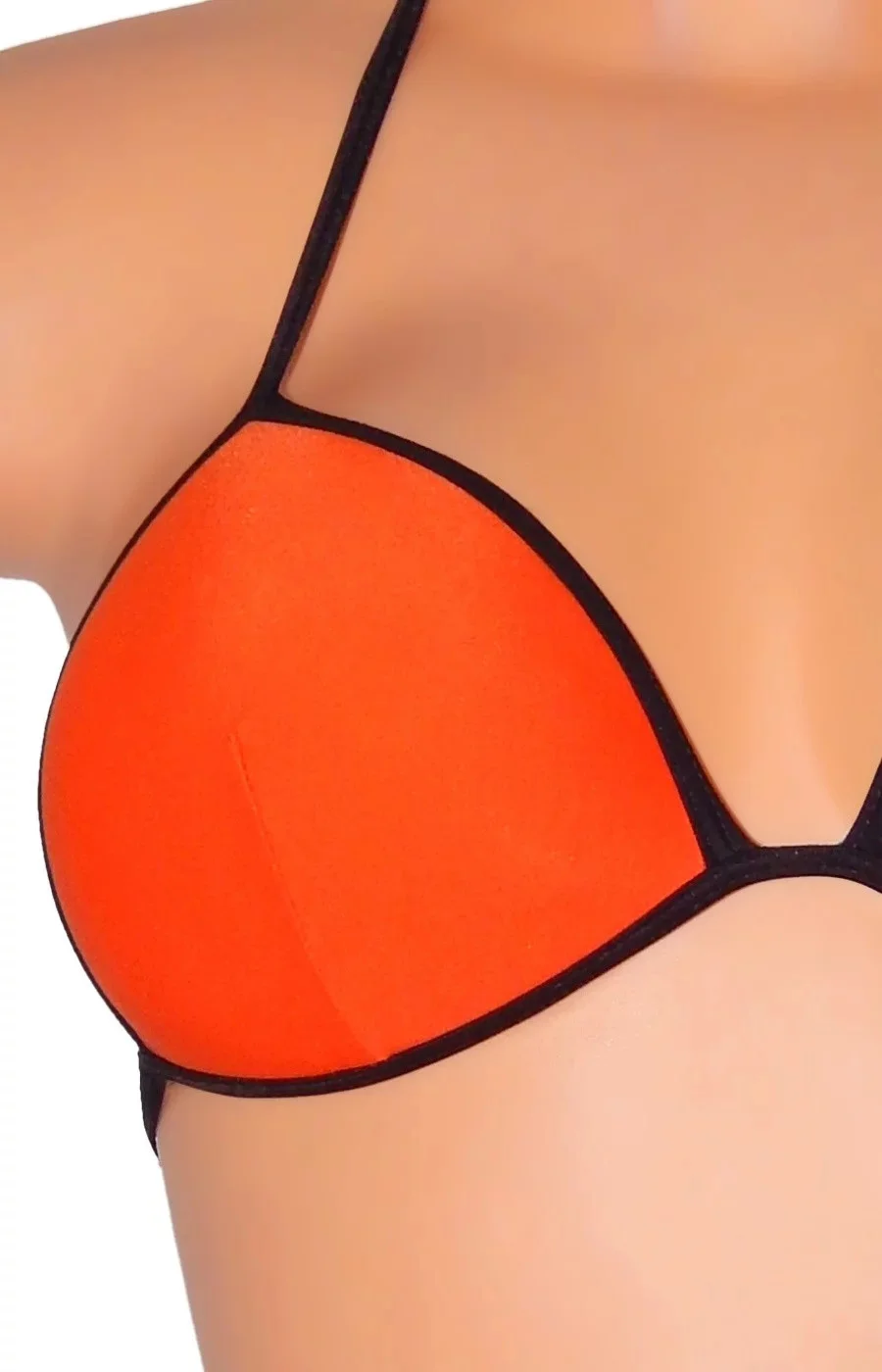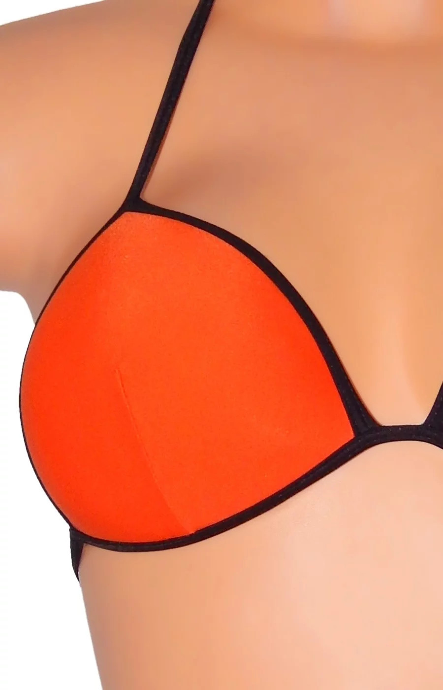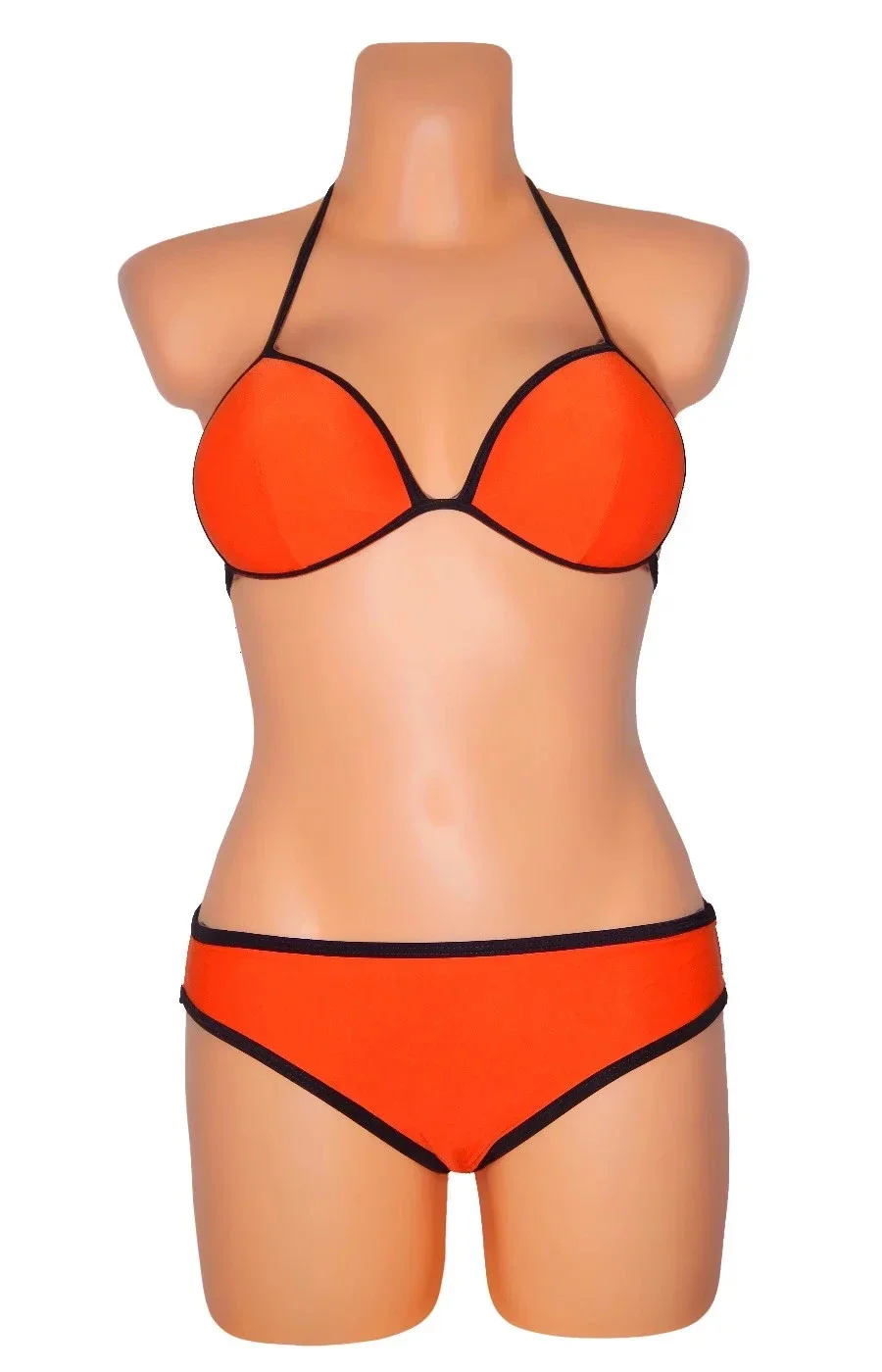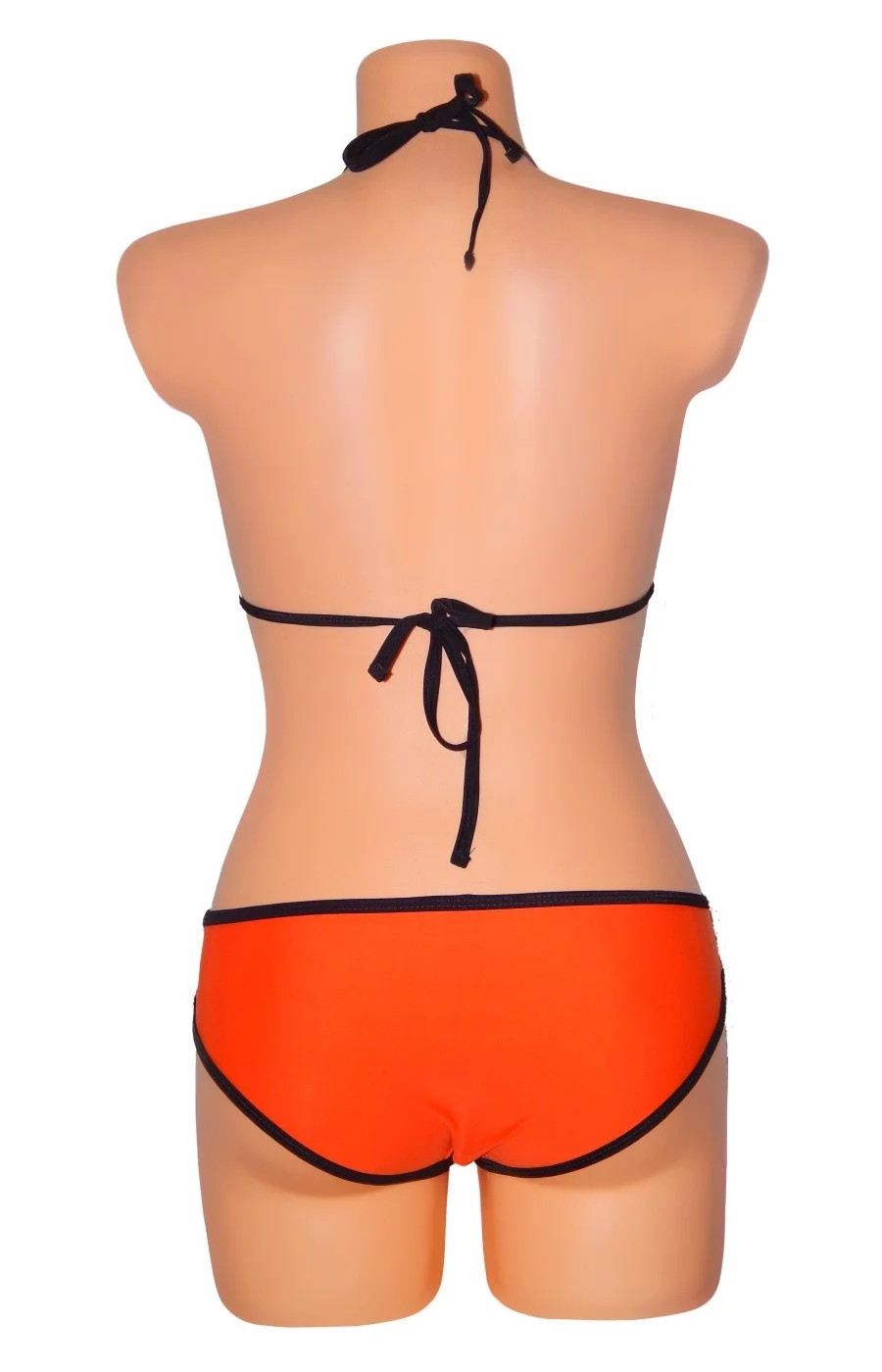 Dámské dvoudílné plavky opalovací, bikiny s polstrovanými košíčky (polstrování nelze odejmout). Plavky jsou vyrobeny v módní oranžové barvě a doplněny černými lemy, které podtrhují kontury obou dílů plavek. Podprsenka se zavazuje tkanicemi na zádech a za krkem.