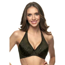 Dámské plavky Fantasy z nové kolekce Elegant. Dámský horní plavkový díl v elegantní černé barvě se zlatým vzorem má nevyztužené podšité košíčky s kosticemi a nižší střed. Střih košíčků a středně široký podšitý obvod podprsenky se širšími zády pro lepší oporu poprsí Vám zaručí pevné a pohodlné nošení tohoto modelu. Ramínka nejsou odepínací, jsou pevná a dají se zavázat pouze za krkem. Zadní zapínání je širší. U těchto plavek lze libovolně kombinovat spodní a horní díl v řádu zadaných velikostí jednotlivých dílů. Plavky jsou české výroby a koupí tohoto výrobku podpoříte produkci českého oděvního průmyslu.