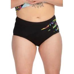 Dámske plavky české firmy FANTASY - spodní díl. Kalhotky klasického střihu mají vysoký pas. Na levém boku v přední části jsou našity klínky barevné látky a prošití zasahuje diagonálně na druhou stranu. V pase a nohavičkách je našitá pružná gumička. Celý díl je podšitý rychleschnocí látkou.