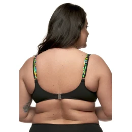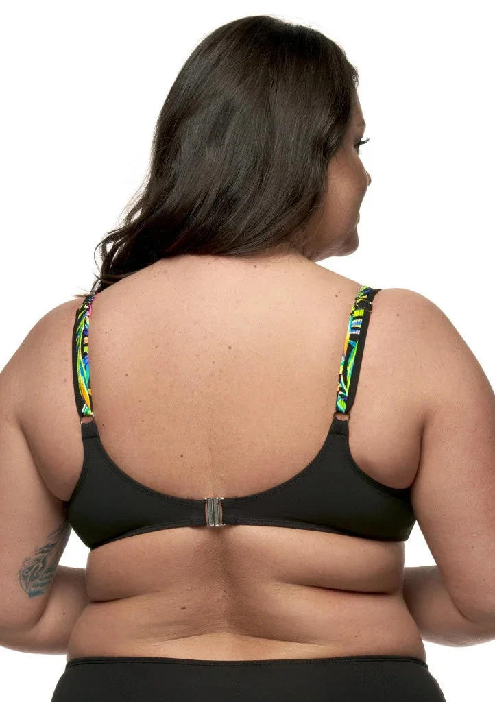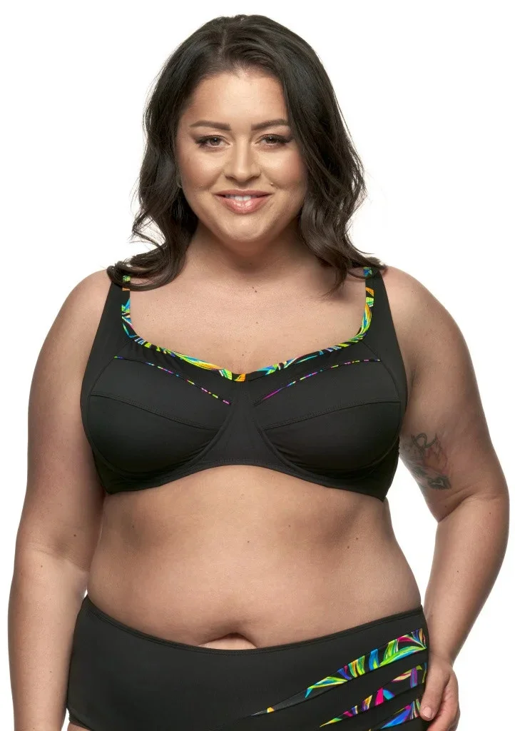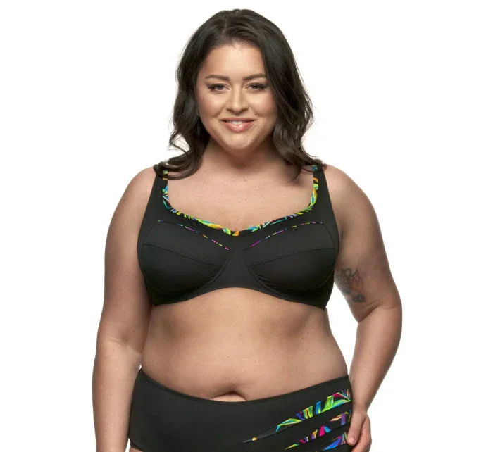 Dámské plavky FANTASY z kolekce Tropic. Plavková podprsenka není vyztužená, má kostice a vyšší střed. Má členěné košíčky pro dostatečnou oporu i většímu poprsí, z boku tlačí ňadra mírně k sobě. Širší ramínka jsou všitá pevně a jsou délkově nastavitelná. Obvod je vyšší, v bocích vyztužen silikonovou kosticí, která se Vám přizpůsobí, a je ukončen kovovou sponou na zapínání. Celý díl je podšitý. Podprsenku je možné kombinovat s jakýmkoliv spodním dílem ze stejné kolekce.