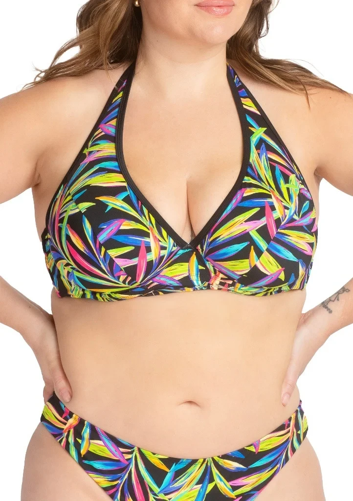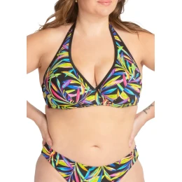 Dámské plavky FANTASY z kolekce Tropic. Nevyztužené košíčky mají kostice a nižší střed. Ramínka jsou součástí košíčku, přechází do mašličky na vázání za krkem. Obvod je lemován pružnou gumičkou, v bocích vyztužen flexibilní silikonovu kosticí. Plavky se vážou vzadu na mašličku, lze tím regulovat délku obvodu. K podprsence lze kombinovat jakékoliv kalhotky ze stejné kolekce.
