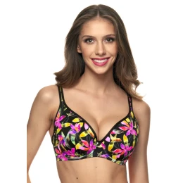 Dámské plavky Fantasy z nové kolekce Robie. Dámský horní plavkový díl s elegantním barevným vzorem má jemně vyztužené nařasené košíčky s kosticemi a nižší střed. Plavky lemuje úzký proužek v černé barvě. Střih košíčků a středně široký obvod podprsenky s bočními pružnými kosticemi Vám zaručí pevné a pohodlné nošení. Podprsenka má nastavitelná ramínka, která lze jednoduše zapnout, nebo uvázat za krk. Zadní zapínání je ukončeno pevně všitou sponou na záháknutí. Plavky jsou české výroby a koupí tohoto výrobku podpoříte produkci českého oděvního průmyslu.
