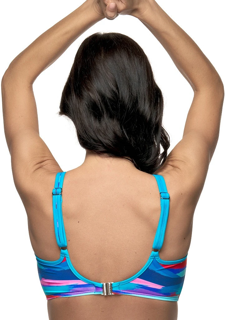 Dámské plavky Fantasy 2026 z nové kolekce Debie. Dámský horní plavkový díl v pestrobarevném provedení má jemně vyztužené nařasené košíčky s kosticemi a vysoký střed. Střih košíčků a široký obvod podprsenky s bočními pružnými kosticemi Vám zaručí pevné a pohodlné nošení a přitom Vám vytvaruje krásný a plný dekolt. Podprsenka má pevně všitá, nastavitelná ramínka. Zadní zapínání je ukončeno pevně všitou sponou na záháknutí. U těchto plavek lze libovolně kombinovat spodní a horní díl v řádu zadaných velikostí jednotlivých dílů. Plavky jsou české výroby a koupí tohoto výrobku podpoříte produkci českého oděvního průmyslu.