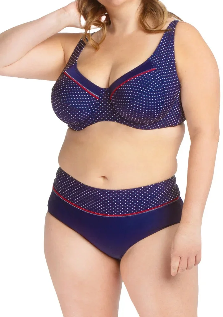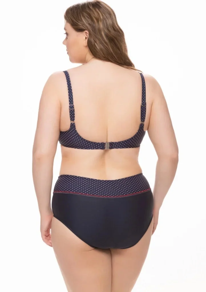 Dámské dvoudílné plavky značky FANTASY. Horní díl tvoří podprsenka klasického střihu s vyšším středem. Košíčky s kosticemi nejsou vyztužené. Jsou ušity tak, aby podržely a pozvedly i větší ňadra. Ramínka jsou pevně všitá a nastavitelná. Obvod je vyšší, v bocích vyztužen ohebnými silikonovými kosticemi, aby podprsenka správně držela na místě. Celý obvod je lemován pružnou gumičkou. Zapínání se nachází v zadní části ve formě kovové spony. Spodní díl tvoří kalhotky v klasickém střihu s vyšším pasem. V nohavičkách je našita pružná gumička. Horní i spodní díl jsou celé podšity.