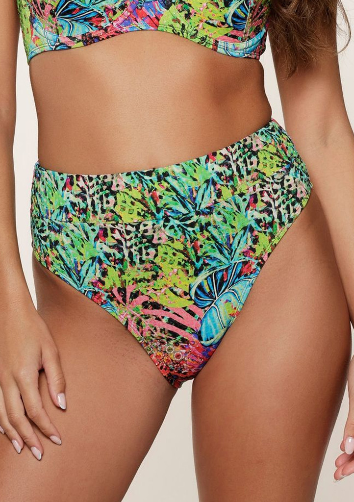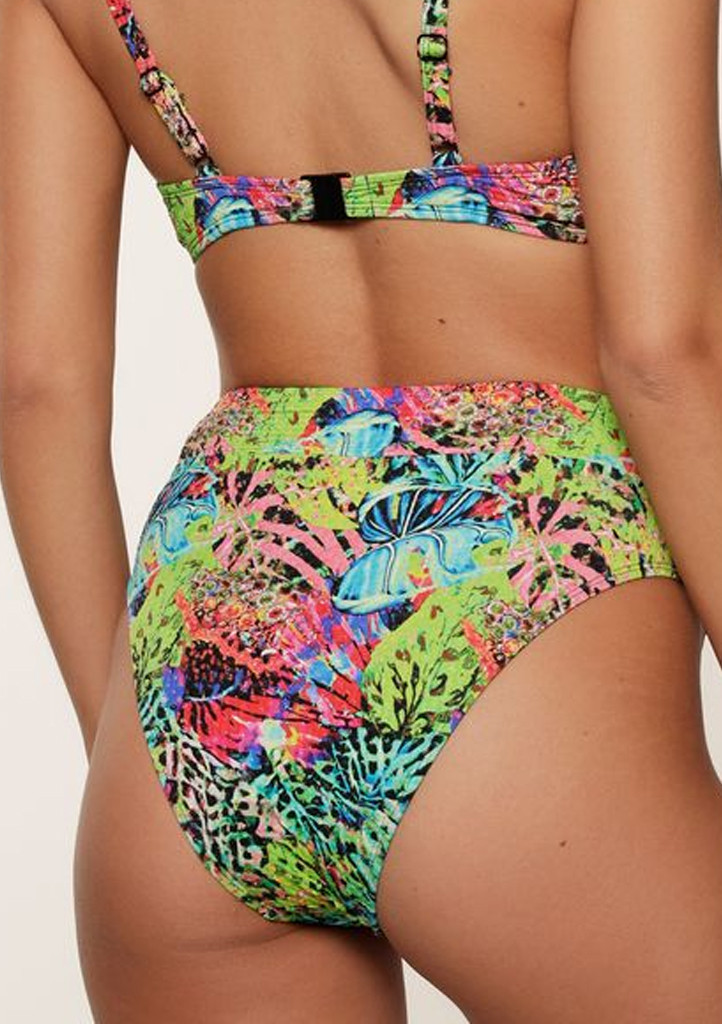 Stylový spodní díl plavek s vysokým pasem z kolekce Tropic Floral od značky LingaDore zaujme nejen svým pestrobarevným tropickým vzorem, ale i lichotivým střihem. Vysoký pas opticky zeštíhluje a zakrývá problematické partie, zatímco elastický materiál se přizpůsobí postavě a poskytuje maximální pohodlí.