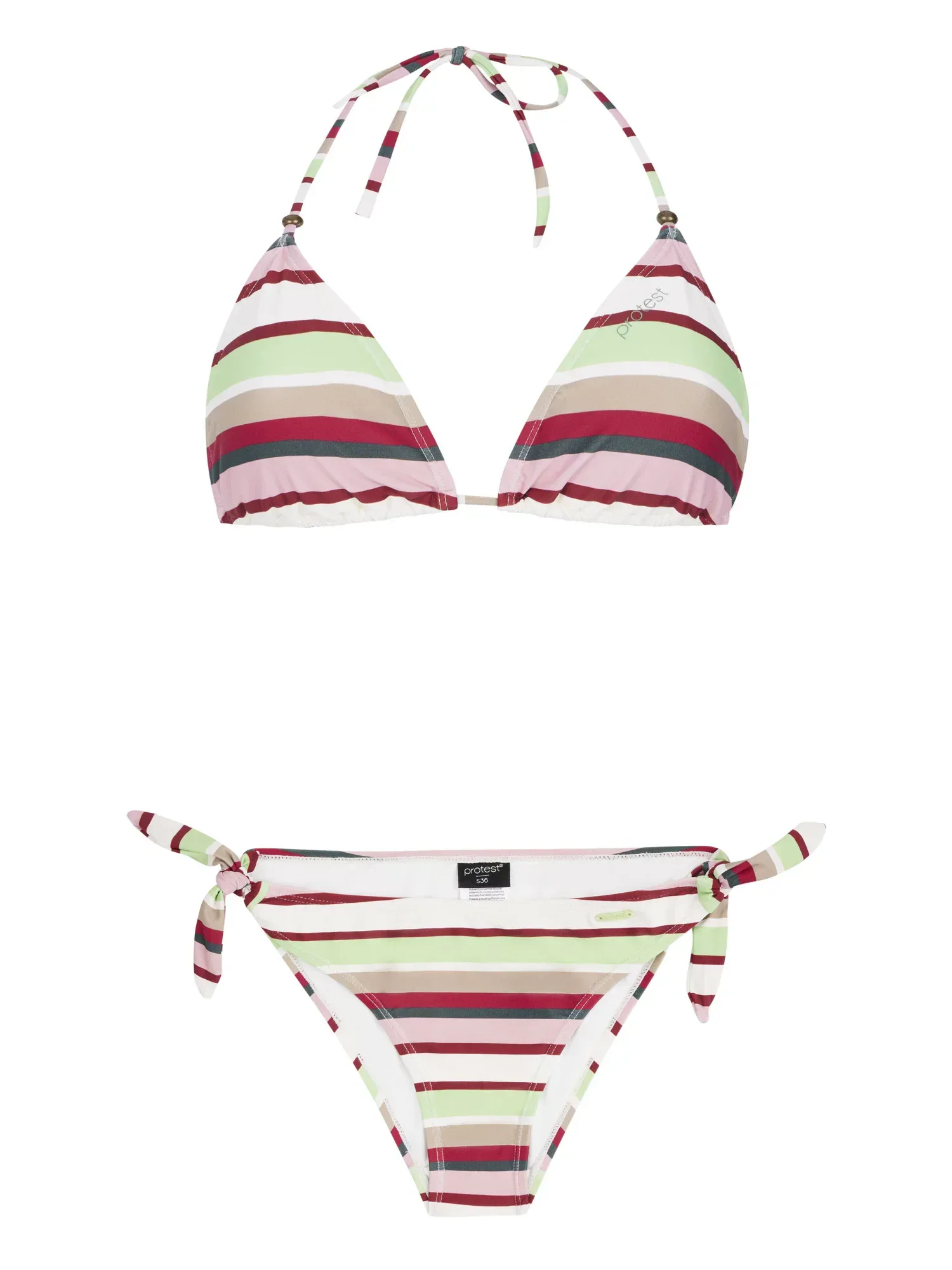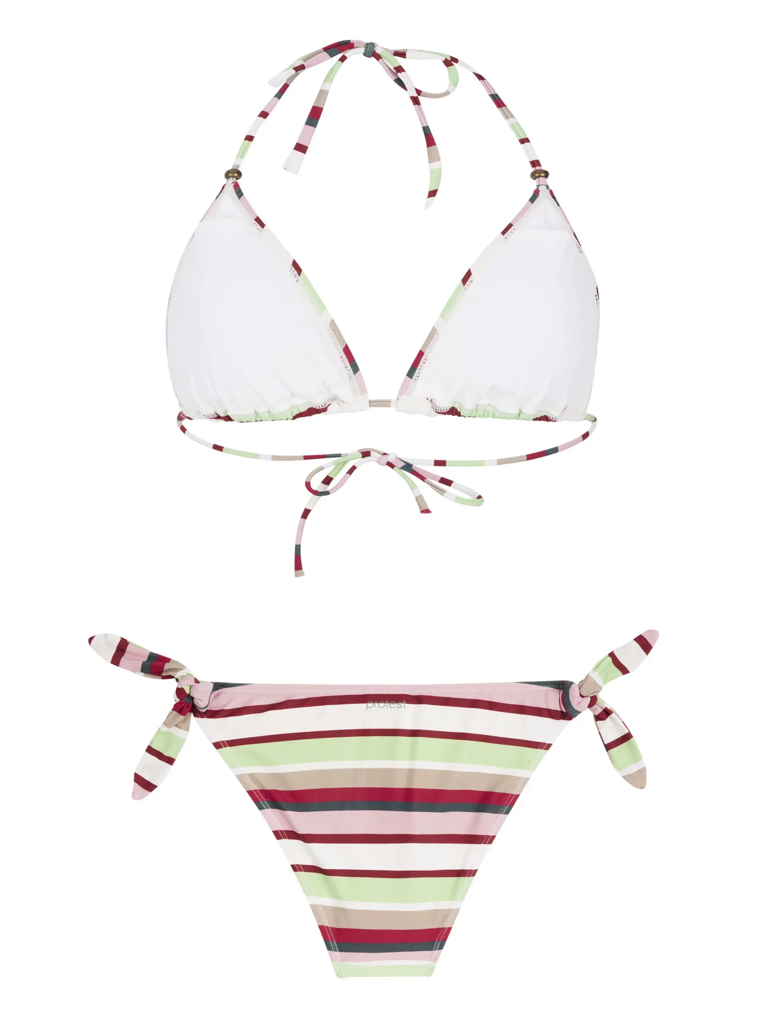 Tato sada je dodávána s krásným trojúhelníkovým topem bikin s podpůrným, přizpůsobitelným střihem díky zavazování na zádech a krku a odnímatelným rychleschnoucím košíčkům.