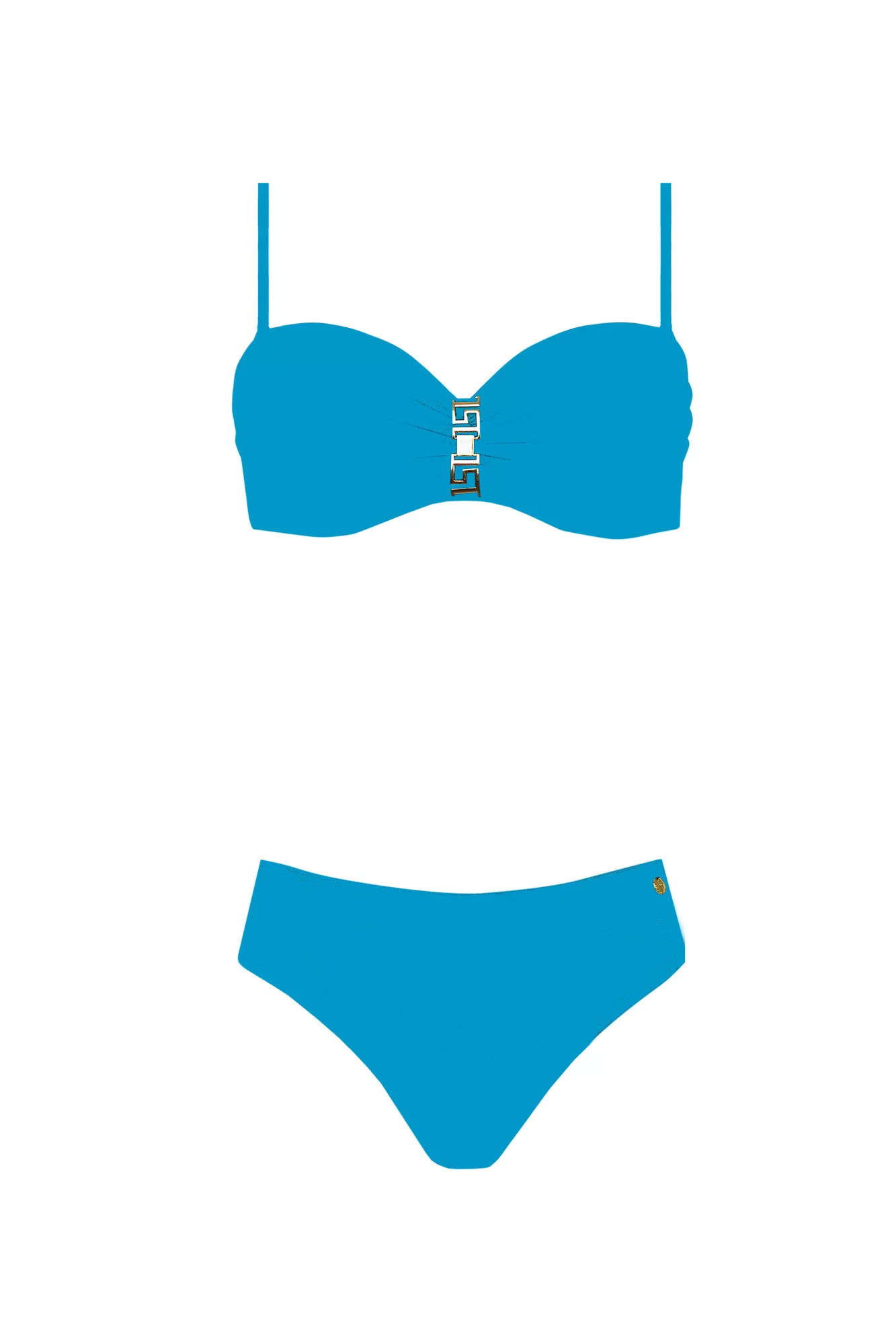 Dámské dvoudílné plavky, spodní díl klasické kalhotky, vrchní díl vyztužený, uprostřed zdobený zlatou sponou. Ramínka na posouvání.